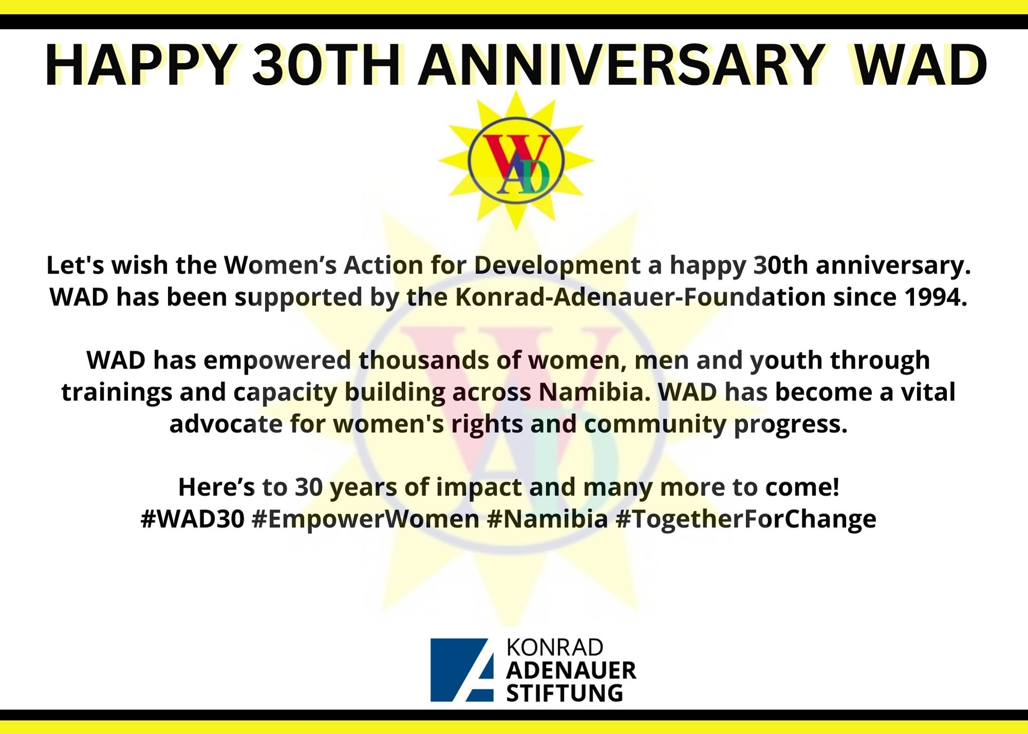 Since 1994, KAS has supported the Women's Action for Development, to continue advocating for the rights of women and empowering communities across Namibia. We are proud to announce the celebration of WAD's 30th Anniversary and wish our organisational partners all the best going forward. May WAD continue to uplift society at large through capacity building initiatives for the sake of promoting democratic development.