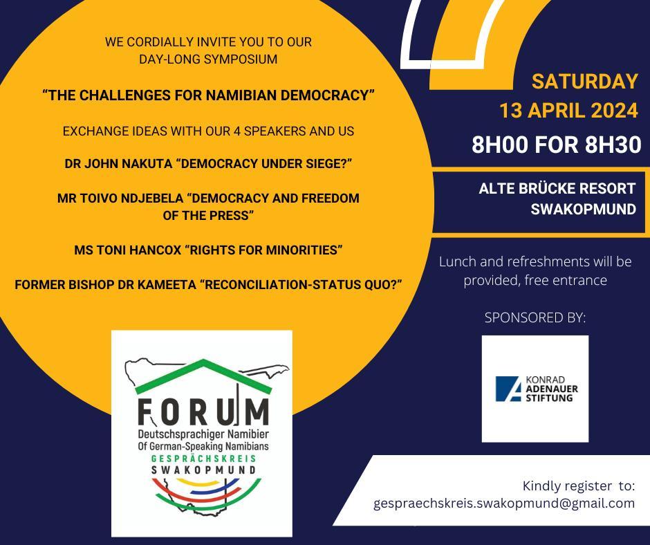 The Forum of German-speaking Namibians (FDN) in association with the Swakopmunder Gesprächskreis and Konrad Adenauer Stiftung Namibia-Angola Country Office are hosting a one-day symposium on 13 April 2024 with the aim to exchange insights on the challenges that Namibia's Democracy faces and recommendations on the way forward. Together with four guest speakers, the discussion roundtable aims to engage around 70 invited guests.