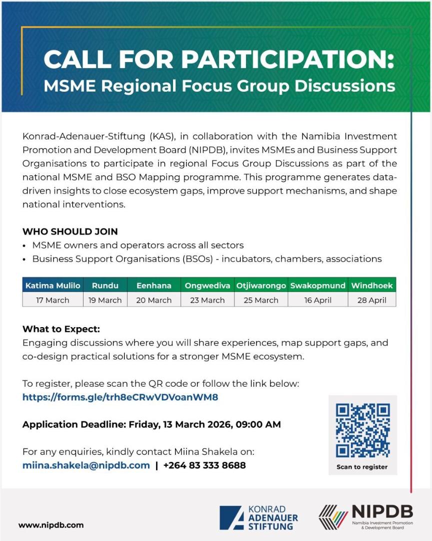 The Konrad-Adenauer-Stiftung (KAS), in collaboration with the Namibia Investment Promotion and Development Board, has officially commenced its nationwide regional consultations under the MSME and BSO Mapping Programme. This initiative forms part of ongoing efforts to strengthen dialogue, coordination, and development within Namibia’s Micro, Small and Medium Enterprise (MSME) sector.
