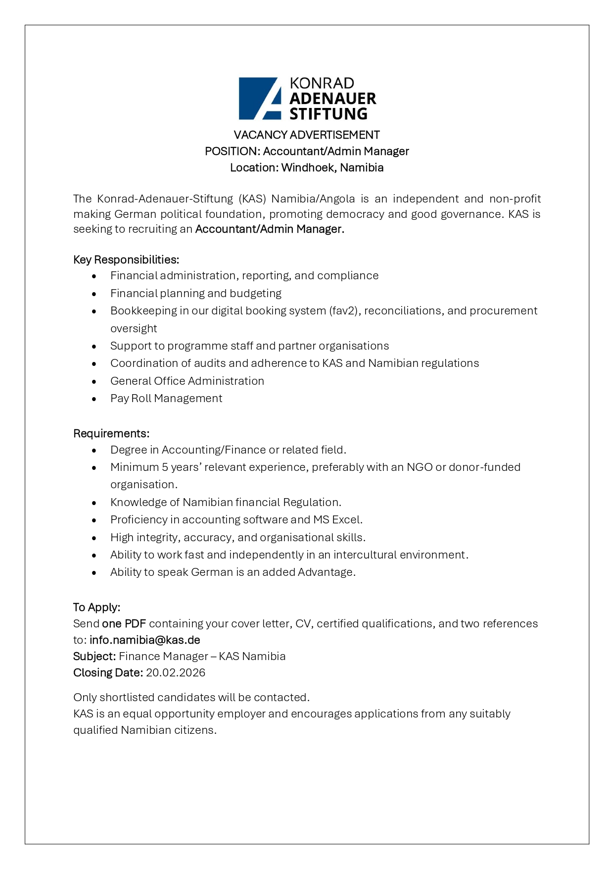 The Konrad-Adenauer-Stiftung (KAS) Namibia/Angola is an independent and non-profit making German political foundation, promoting democracy and good governance. KAS is seeking to recruiting an Accountant/Admin Manager.