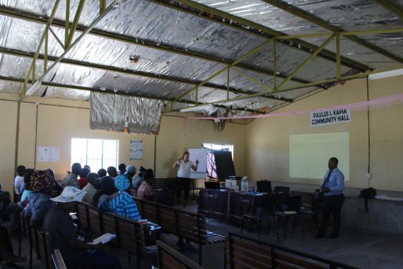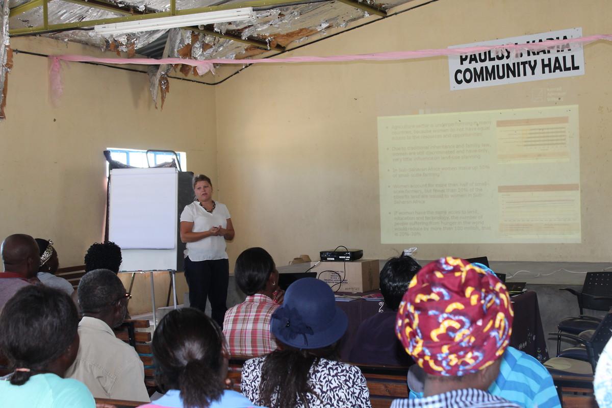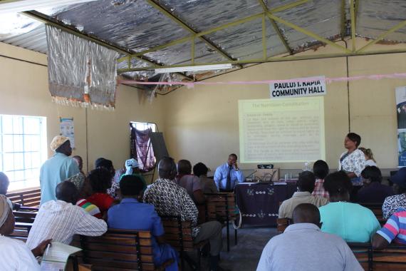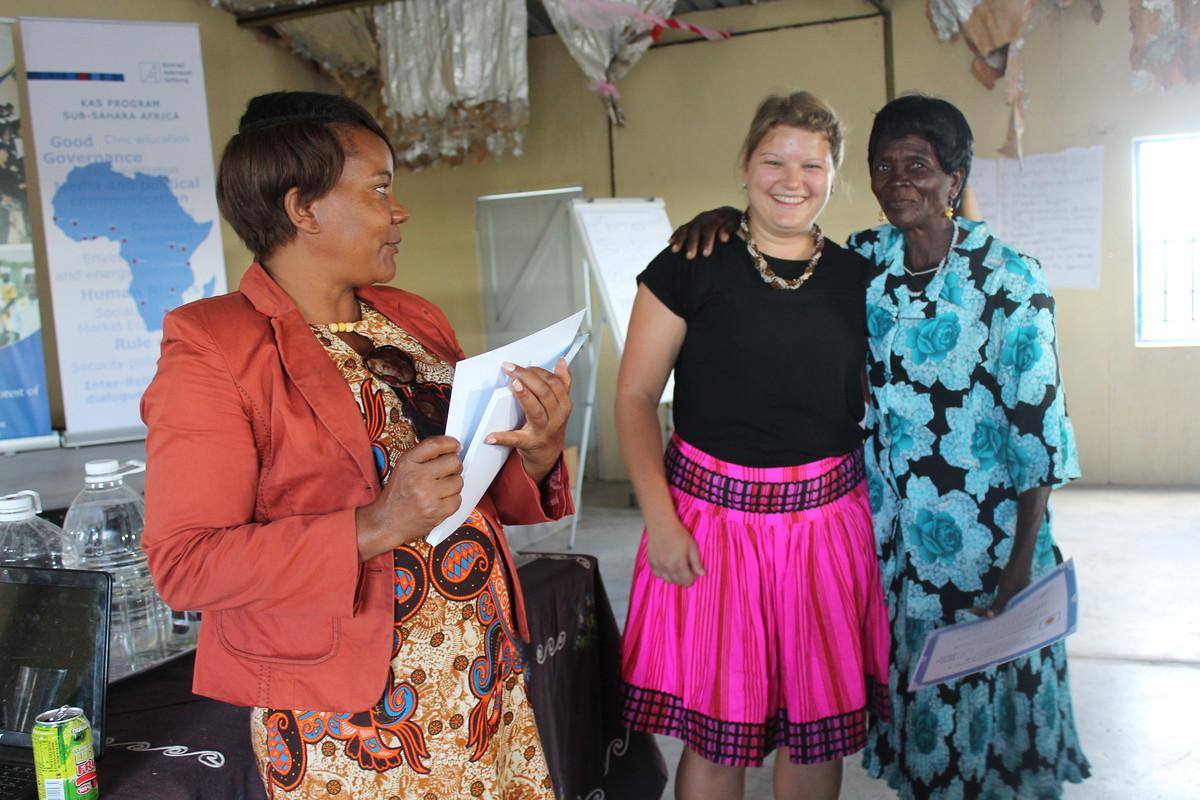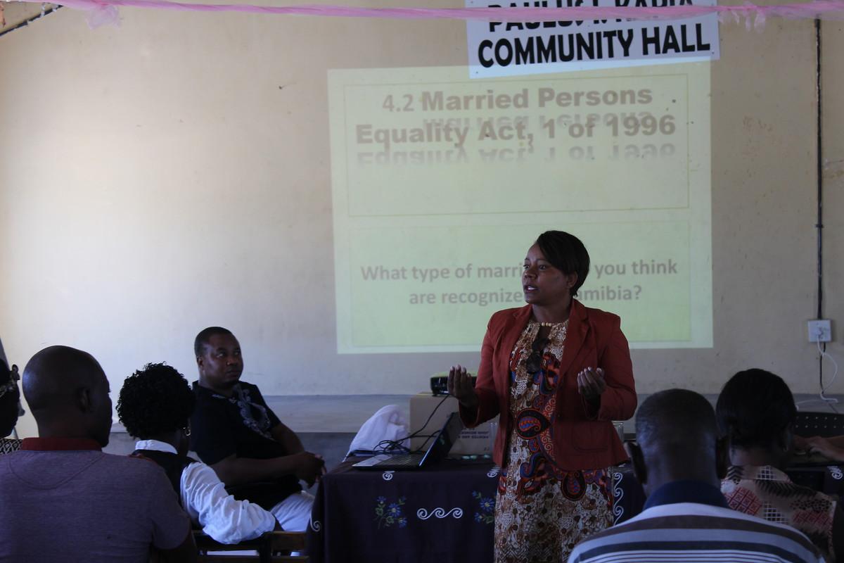 The participants were mostly women from the community, but also members of the Ministry of Gender Equality and Child Welfare, Ministry of Poverty Eradication and Social Welfare, Ministry of Health and Social Services, Police officers as well as interested married and single men. The workshop had the target to inform and train the participants on Human Rights, the Namibian Constitution, the differences between traditional and codified law, as well as rights guaranteed to women in the context of the Communal Land Reform Act. Especially the explanations on Human and women’s rights provided vital information to the participants as many of them hadn’t known about gender equality inter alia guaranteed by the Constitution. The workshop was very well attended and full of discussion, questioning and experience sharing. The discussions especially centered on the procedures of the Communal Land Reform Act and controversial opinions on will-writing. The participants reported of their struggles with allocating land and that they need to learn more on their rights and how to claim them by additional workshops. Special thanks to the Okatjali Constituency Council for the support and the possibility to hold the workshop in their community hall.