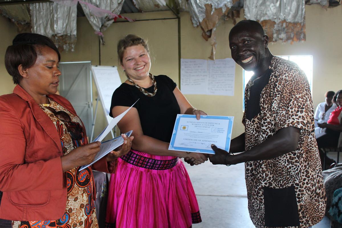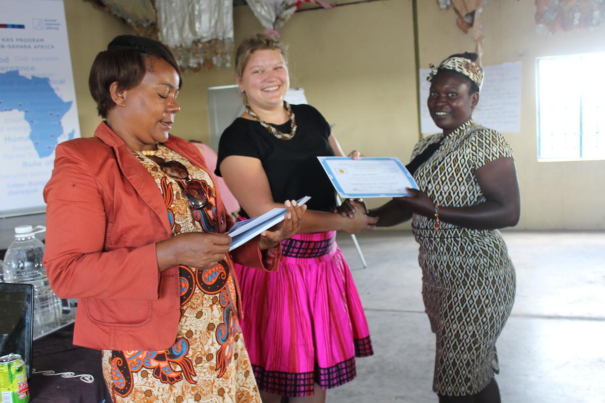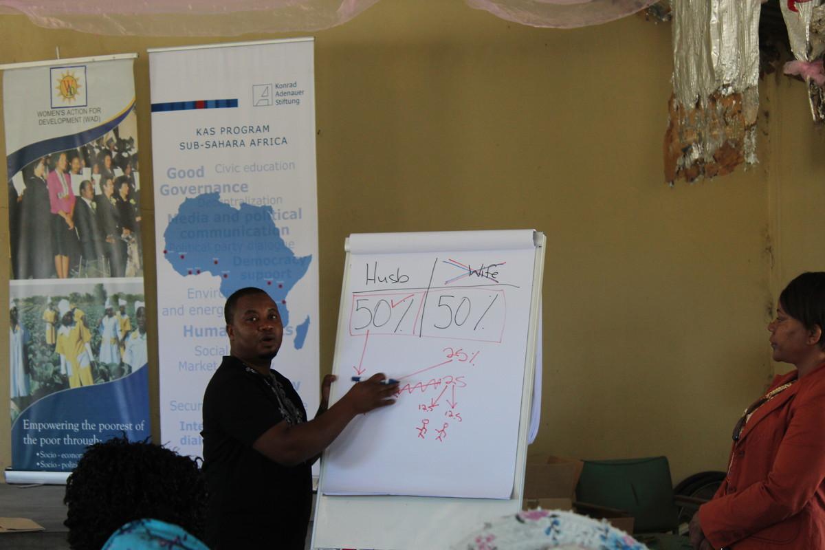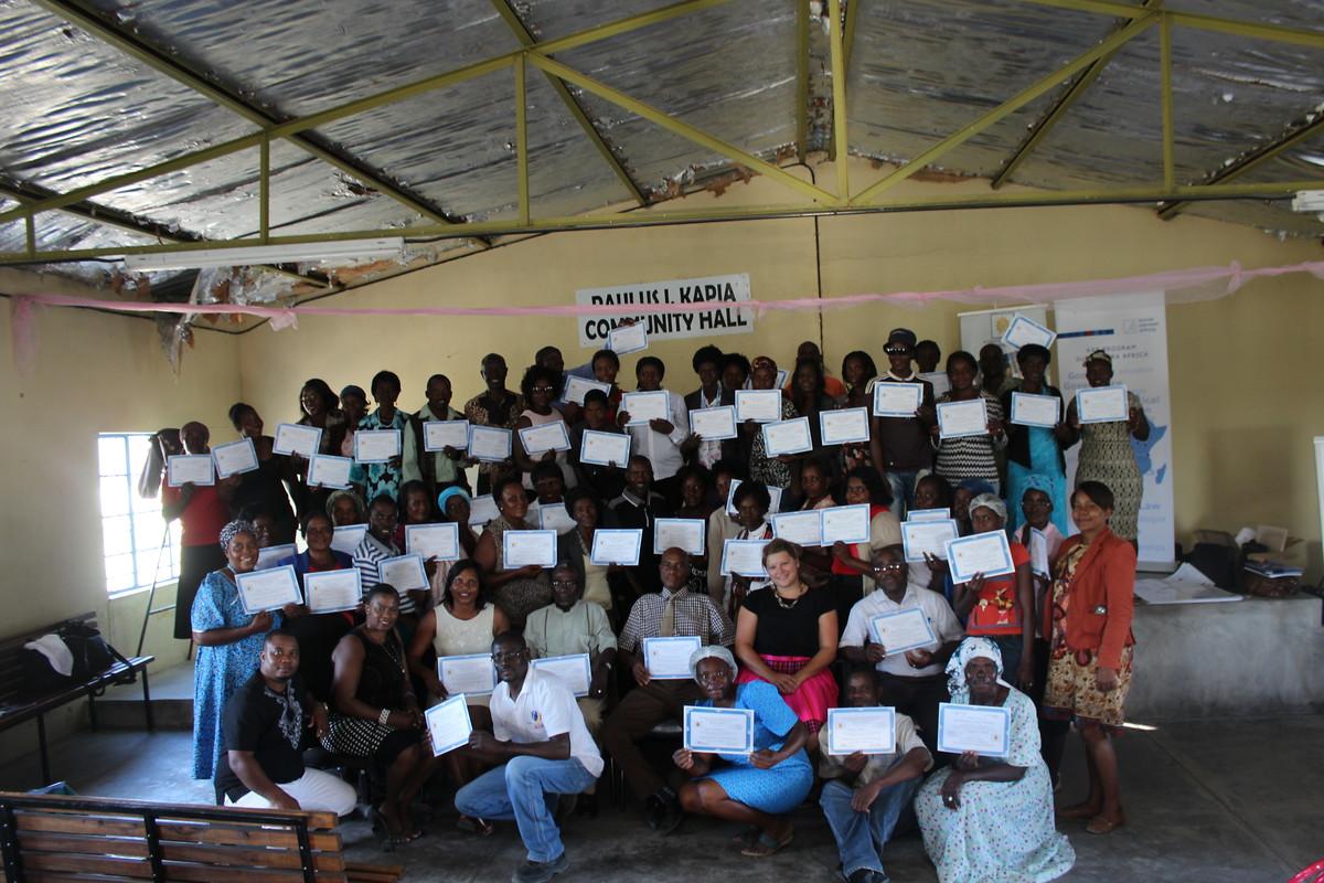 The participants were mostly women from the community, but also members of the Ministry of Gender Equality and Child Welfare, Ministry of Poverty Eradication and Social Welfare, Ministry of Health and Social Services, Police officers as well as interested married and single men. The workshop had the target to inform and train the participants on Human Rights, the Namibian Constitution, the differences between traditional and codified law, as well as rights guaranteed to women in the context of the Communal Land Reform Act. Especially the explanations on Human and women’s rights provided vital information to the participants as many of them hadn’t known about gender equality inter alia guaranteed by the Constitution. The workshop was very well attended and full of discussion, questioning and experience sharing. The discussions especially centered on the procedures of the Communal Land Reform Act and controversial opinions on will-writing. The participants reported of their struggles with allocating land and that they need to learn more on their rights and how to claim them by additional workshops. Special thanks to the Okatjali Constituency Council for the support and the possibility to hold the workshop in their community hall.