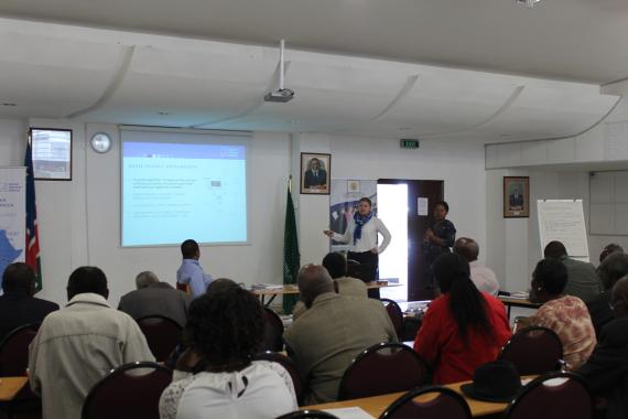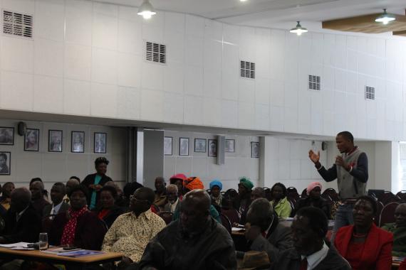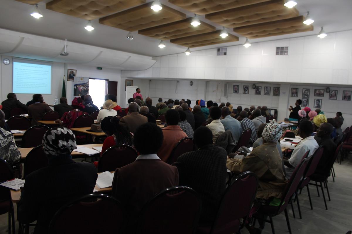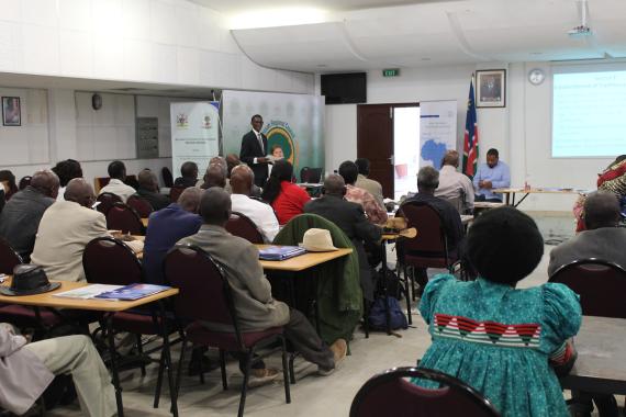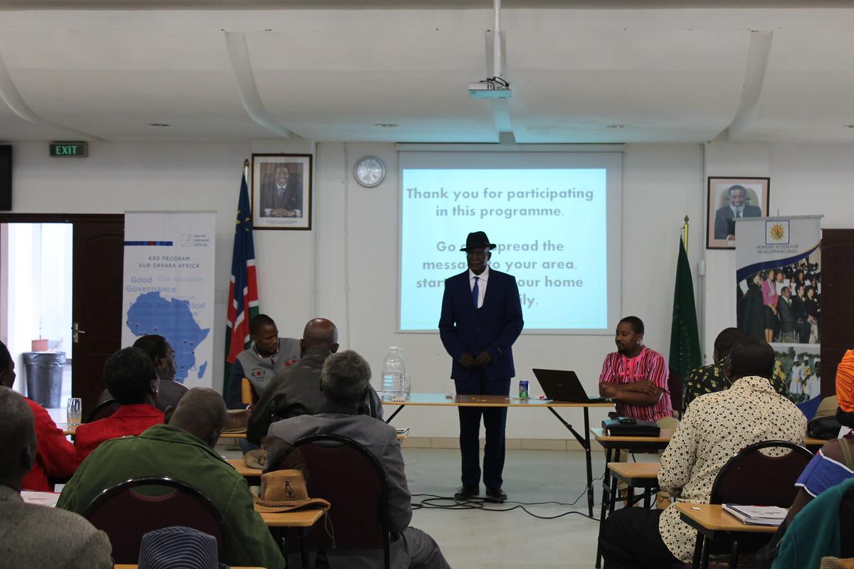 Die Teilnehmer und Teilnehmerinnen des Workshops, bestehend aus Vertretern der traditionellen Autoritäten und Frauen, wurden vom Gouverneur der Omusati Region, Hon. Erginus Endjala, begrüßt. In seiner Rede betonte er die bedeutende Rolle der Veranstaltungsreihe, die den Bedürfnissen der Menschen in den Projektregionen entgegenkomme und Themen wie Frauen- und Landrechte auf die Tagesordnung bringe. In diesem Zusammenhang bedankte er sich für den Einsatz von KAS und WAD in diesem Feld. Der Workshop stieß bei allen Teilnehmern und Teilnehmerinnen auf große Resonanz. So waren auch die Ergebnisse vorheriger Diskussionen Teil der Veranstaltung. Die Präsentation des Traditional Authorities Act löste eine lebhafte Debatte über die Rechte und Pflichten der traditionellen Autoritäten aus. Daraus lässt sich schlussfolgern, dass die behandelten Themen im Workshop nachvollziehbar und einleuchtend für alle Teilnehmer und Teilnehmerinnen präsentiert wurden. Die deutlich größere Zahl der teilnehmenden Personen am zweiten und dritten, sowie auch am letzten Tag des Workshops, verstärkte die Diskussion erneut, vor allem als der Communal Land Reform Act und die Gleichbehandlung und Gleichberechtigung von Frauen in diesem Gesetzeskontext thematisiert wurden. Am Ende des Workshops bedankte sich der Chief der traditionellen Autorität der Ombalantu bei den Veranstaltern und legte einen gemeinsamen Termin für alle traditionellen Autoritäten fest, zu dem das Erlernte nochmals besprochen werden soll, damit alle Dorfbewohner von dem neu erlangten Wissen profitieren können.