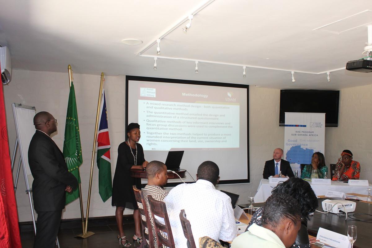 KAS was delighted by the attendance of Hon. Priscilla Boois, Deputy Minister of the Ministry of Land Reform, Namibia. In her opening remarks Hon. Boois mentioned that although the land rights access for women in Namibia has already improved through legal adjustments, there are still existing disadvantages for women especially in rural regions where many women still depend on their spouses or families. This challenge was also addressed by Mrs. Louise Shixhwameni, Director Performance Improvement, Office of the Prime Minister of Namibia, in her passionate speech in which she claimed to harmonize the customary land rights with the Namibian Constitution. KAS also appreciated the attendance of the Hon. Chairpersons of the Regional Councils of the four project regions in Namibia: Hon. Gerson Kapenda (Oshana Region), Hon. Modestus Amutse (Omusati Region), Hon. Samuel Shivute (Oshikoto Region), Hon. Erickson Ndawanifa (Ohangwena Region). Their attendance shows the governmental awareness of the project and indicates their efforts to face the women’s situation.