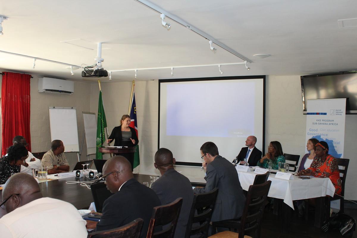 The conference gave the very first opportunity to present the results of the baseline studies from Malawi, Zimbabwe and Namibia. The presentations gave detailed information on the current situation and legal frameworks in the project countries. Afterwards the various country perspectives were discussed fruitfully by the cooperation partners and KAS representatives which led to good prospects of appropriated next steps in the projects. The project managers Stefanie Braun for Namibia and Dr. Samson Lembani for Malawi and Zimbabwe gave an outlook on their planned project activities, which for Namibia include further workshops with women in rural areas, Traditional Authorities and members of the Communal Land Board as well as publishing information materials and repeating the very successful roadshow during the Ongwediva Trade Fair in August 2017 to raise awareness on women’s land rights.