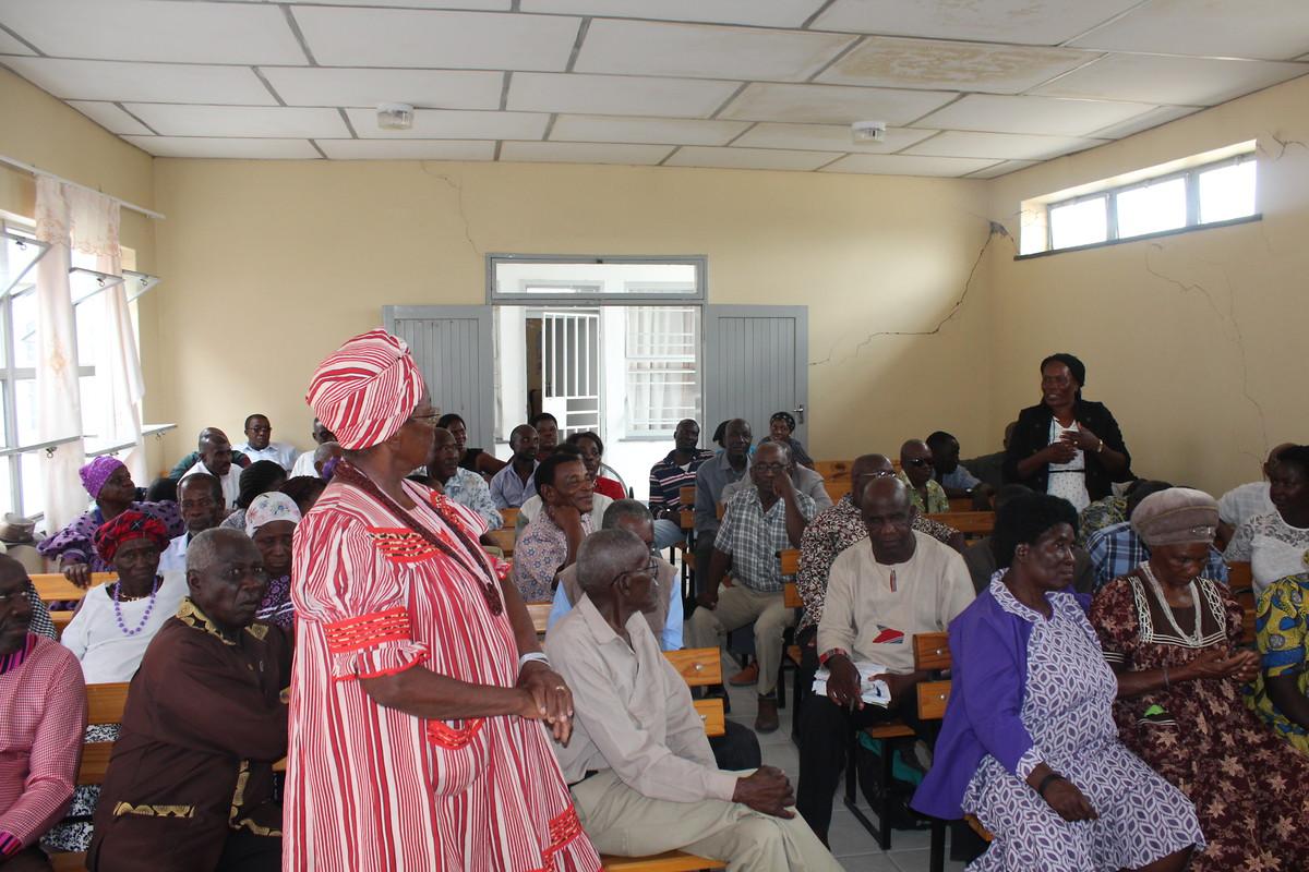 As part of the first workshop, 65 traditional autorities of the Oukwanyama experienced four exciting and informative workshop days. At the beginning of the workshop Mr.Popyeninawa Dyenimo welcomed the participants and emphasized the importance of this event. He encouraged all participants to get involved as much as possible and to participate in discussions and Q & A sessions. Subsequently, Stefanie Braun, project manager of the Konrad Adenauer Stiftung (KAS) and Absai Kashululu, national training coordinator of "Women's Action for Development" (WAD), welcomed the participants and explained the structure and contents of the coming days. After a short introduction of the project "One World – No Hunger", a preliminary evaluation of the workshop took place. It became clear that many participants were previously unaware of the importance of human rights and gender equality. As part of the workshop, under the guidance of National Training Coordinator Absai Kashululu, participants focused in particular on the Traditional Authorities Act, the importance of communal land, and the consideration of vulnerable groups such as widows, orphans etc.