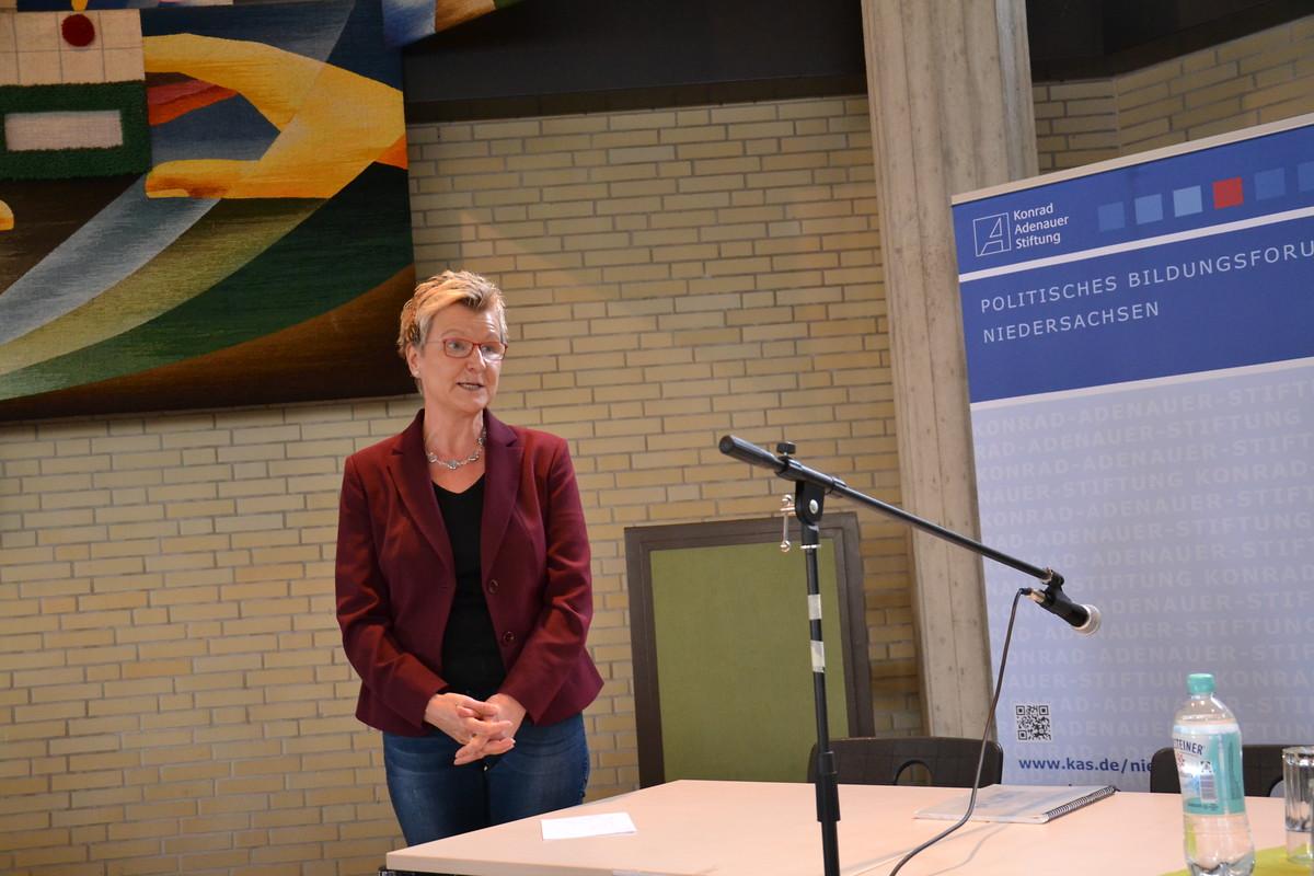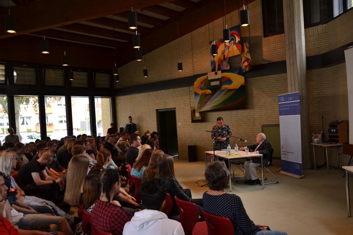 Heidelinde Klimm, die Schulleiterin der BBS Helmstedt, begrüßt ihre Schüler und ganz herzlich den Referenten Sally Perel.