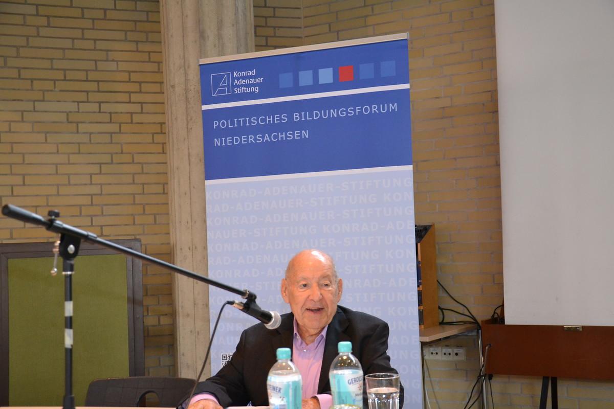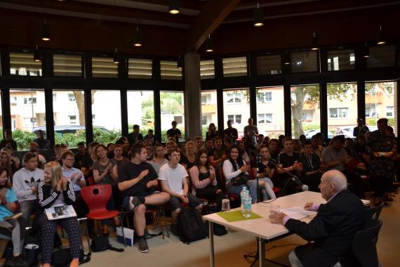 Der 93-Jährige nimmt in der Aula Platz … es folgte ein genialer Vortrag und eine lange, hochinteressante Diskussion.