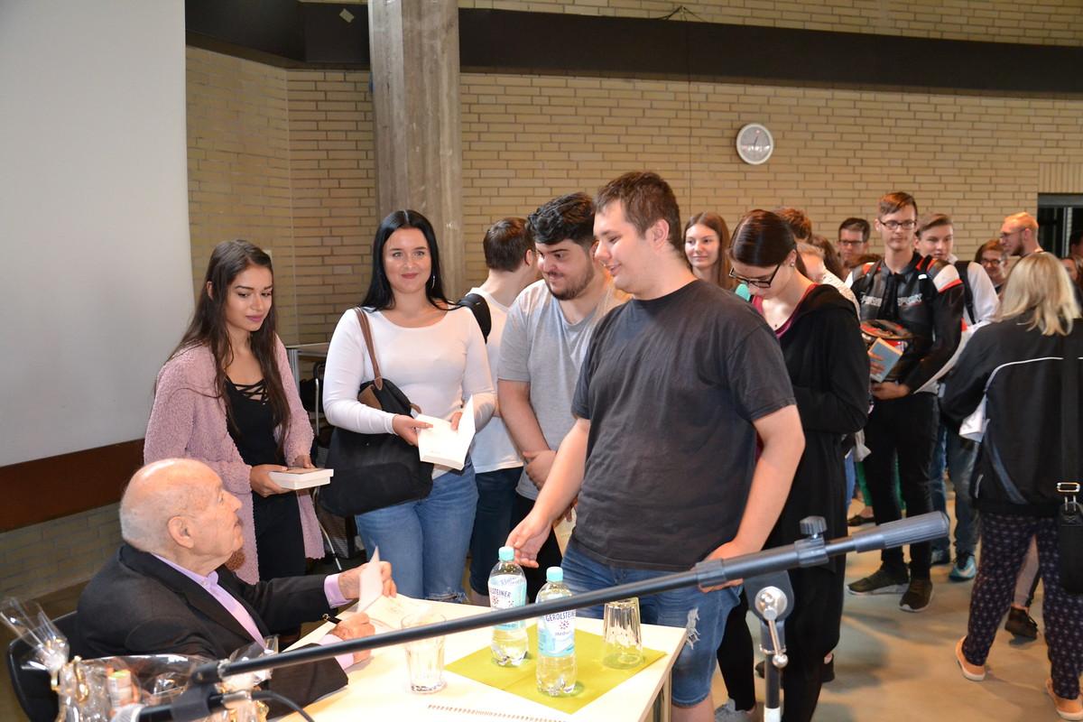 Am Ende der Veranstaltung kaufen viele Schüler das Buch von Sally Perel und lassen es sich von ihm signieren.