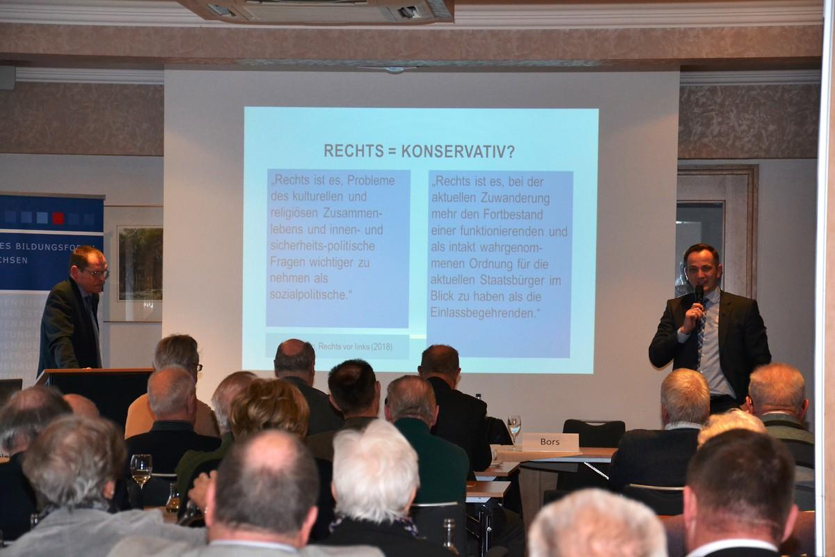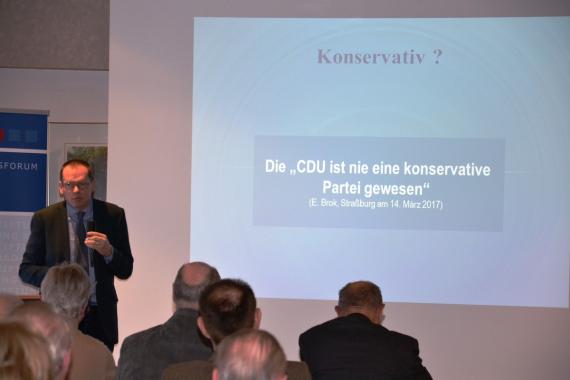 In den Medien würde der Begriff „konservativ“ gleichgesetzt mit einer politisch rechten Einstellung. Der Referent kritisierte diese falsche Annektierung des Begriffes und erläuterte, dass der Konservatismus eine politische Grundhaltung sei, die in der Mitte der Gesellschaft begründet ist. Er fasste zusammen: es sei die Aufgabe des Konservatismus, Veränderungen wahrzunehmen, den notwendigen Handlungsbedarf zu untersuchen und letztendlich schrittweise neue Ansätze in Altbewährtes zu implementieren.