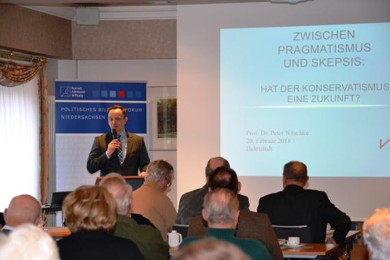 Nach einer kurzen Begrüßung und Hinführung zum Themenbereich durch Christoph Bors,den Leiter des Politischen Bildungsforums Niedersachsen, referierte Prof. Dr. Peter Nitschke von der Universität Vechta zur Begriffsdefinition, geschichtlichen Entstehung und Zukunft des Konservatismus.
