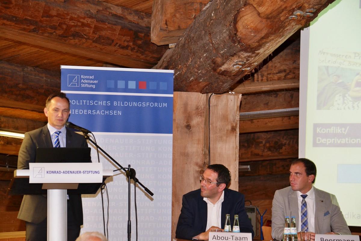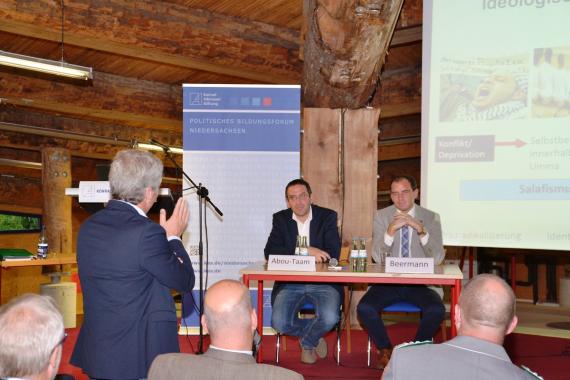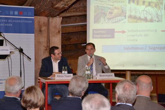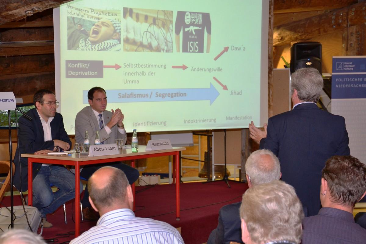 Als Sicherheitsrisiko nannte er die wachsende Zahl an Rückkehrern aus dem Islamischen Staat (IS): So seien allein aus Deutschland rund 960 Personen als Dschihadisten nach Syrien und in den Irak gegangen, um dort für den IS zu kämpfen; ein Drittel sei inzwischen wieder nach Deutschland zurückgekehrt. Diese an Waffen und im Bombenbau ausgebildeten Rückkehrer seien nicht zuletzt deshalb „ein Riesenproblem, weil man nicht in deren Köpfe blicken kann“, so Abou-Taam.
