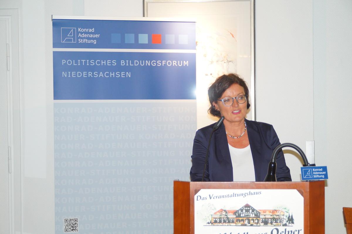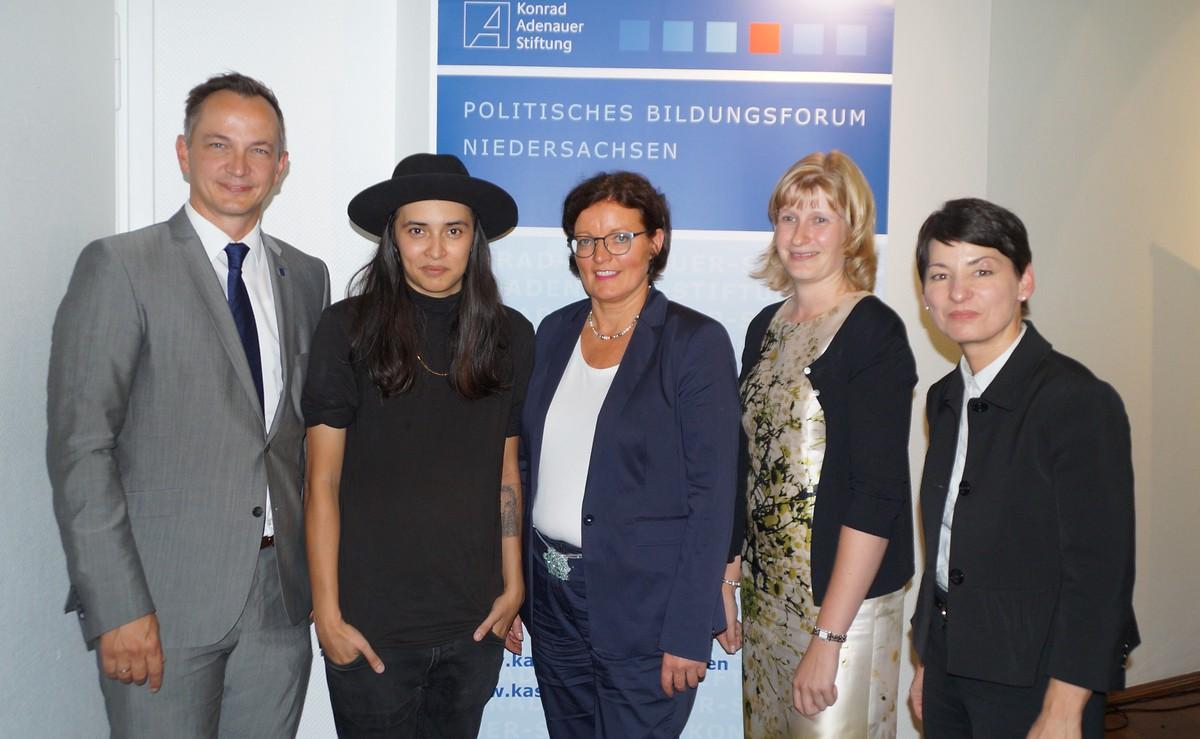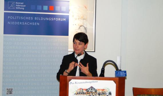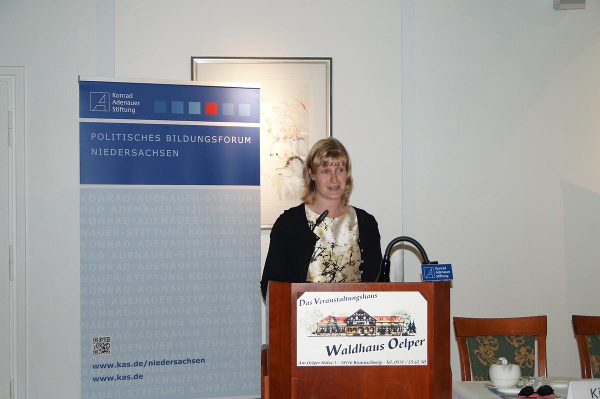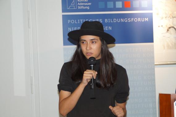 Als Vertreterin der jungen Frauen in der Politik schilderte Diana Kinnert, Au-torin und Bloggerin, über ihre Erfahrungen in der Politik. Seit zehn Jahren ist sie aktives Mitglied der CDU, vorher war sie bereits in der Jungen Union tätig. Sie skizzierte der Zuhörerschaft ihren „steinigen“ Weg in die Politik. Dabei sprach sie vor allem veraltete und ineffiziente Organisationsstrukturen an, die für junge Menschen als Hürde empfunden würden. Ob nun der analoge Ausdruck der Mitgliedschaftspapiere, der auf postalischem Weg versendet werden musste, oder die langjährige Anwesenheitspflicht in der Kommune und damit einhergehende Verwurzlung vor Ort. Junge Menschen müssten gezielter angesprochen werden, dazu gehöre eben auch online von überall aus Zugriff auf Basisdokumente zu haben. Kinnert sprach sich klar gegen eine Frauenquote in der Politik aus. Moralische Appelle seien für sie an dieser Stelle nicht zielführend. Viel wichtiger erscheint es ihr, Sprache in Zahlen und Werte zu übersetzen: Wenn Frauen nicht nominiert und nicht eingesetzt werden, dann benutzen Wirtschaft und Politik einen Großteil ihrer Potentiale nicht und seien folglich nicht so erfolgreich, wie sie sein könnten.