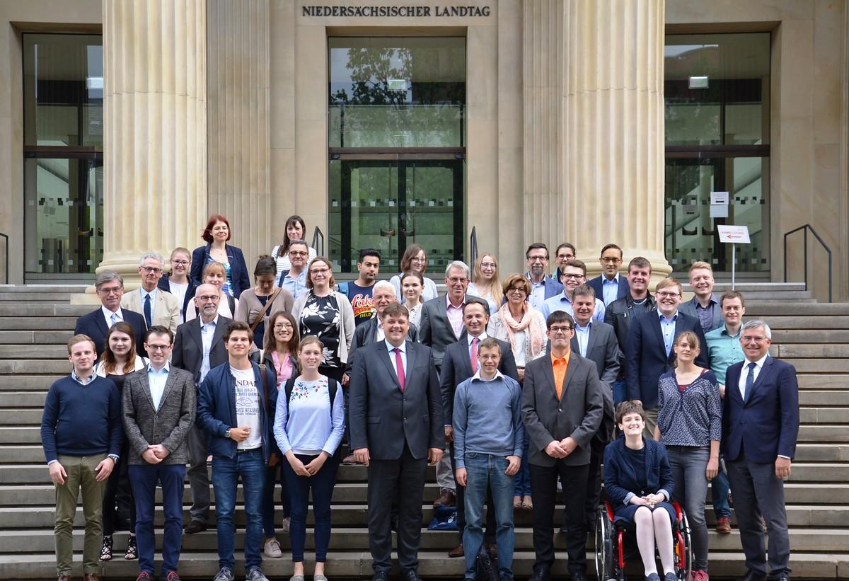 Christoph Bors, Landesbeauftragter der KAS in Niedersachsen begrüßte die Gruppe. Danach folgte eine Führung durch den neugestalteten niedersächsischen Landtag. Von 2014 bis 2017 wurde der Landtag umgebaut und der Plenarbereich modernisiert. Beispielsweise wurde Saal nun um 180 Grad gedreht und ist jetzt heller, größer und entspricht den Anforderungen der modernen Medienwelt. Der Grund für den Umbau des in den Jahren 1957 bis 1962 entstandenen Plenarsaalbereich des Niedersächsischen Landtages, insbesondere des Plenarsaals selbst, waren die nicht vorhandenen funktionalen Anforderungen eines Landtages und der Anspruch, parlamentarische Arbeit transparent zu gestalten. In einigen Teilbereichen gab es zudem starke bautechnische Mängel und ein barrierefreier Zugang war nicht möglich.