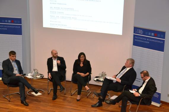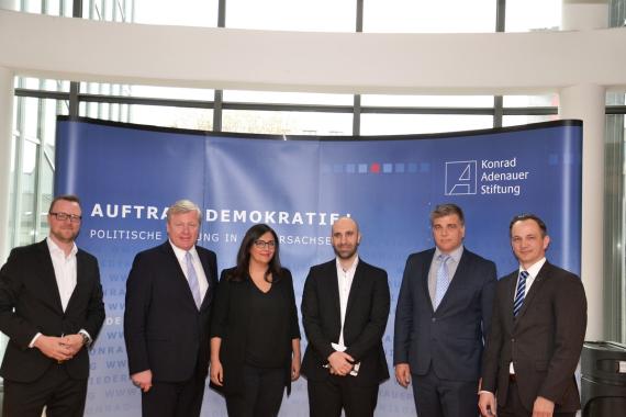 (v.l.n.r.) Martin Brüning, Dr. Bernd Althusmann, Düzen Tekkal, Ahmad Mansour, Prof. Dr. Christoph Rass, Christoph Bors (KAS)