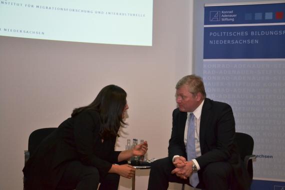 Düzen Tekkal, in Hannover geborene Jesidin und Fernsehjournalistin, zeigte auf, dass sie 200 Prozent Leistung in der Schule bringen musste, um anerkannt zu werden. Gleichwohl lasse sie es nicht gelten, wenn sich Jugendliche mit Migrationshintergrund bei ihr allgemein über Diskriminierung in der Schule beschweren. Auch sie selber hätten sich aktiv einzubringen.