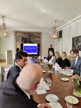 On Friday, April 1st, the group was welcomed to the party offices of the Swedish People’s Party (SFP), where Anders Adlercreutz, MP and head of the SPF party group in Finland’s parliament, the Eduskunta/Riksdagen, who spoke about the at the time ongoing Finnish NATO debate. Following Mr. Adlercreutz, the MP for Åland, Mats Löfström, spoke about the role of Åland’s single MP as part of the SFP party group, and the defense status of the Åland islands. Leaving the SFP party office, the group was treated to lunch by the Finnish Institute for International Affairs (FIIA), where they were welcomed by institute vice director Samu Paukkonen, Senior Researcher Matti Pesu, and Head Researcher Charly Salonius-Pasternak. Following lunch, the group discussed at length the NATO debate in Sweden and Finland with the present FIIA researchers. After the FIIA visit, the group met the Vice-President of Kokoomus Elina Valtonen at the Annex building of Parliament, where Valtonen spoke about her current work in the realm of EU politics and the Future of the EU. After this, the group met the foreign minister of Finland, Pekka Haavisto, at the Foreign Ministry offices at Katajannokka.