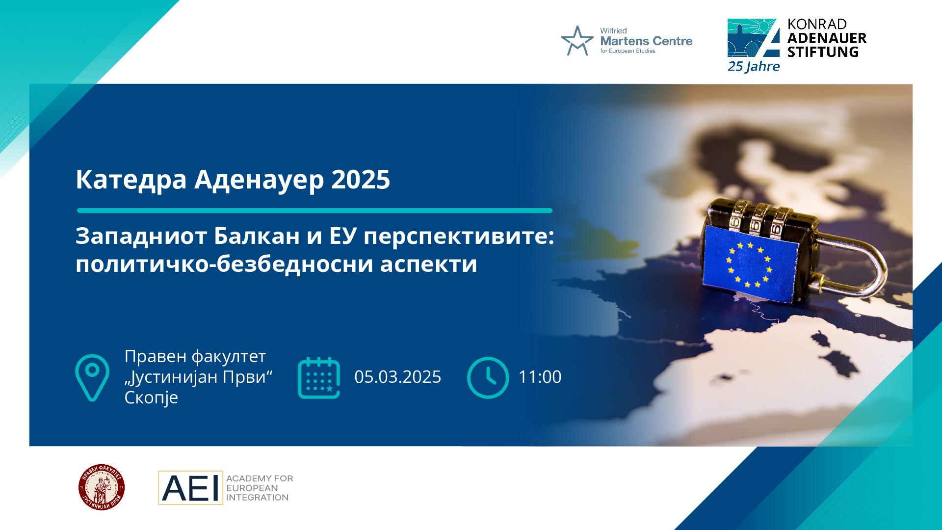 The Konrad Adenauer Foundation, the Wilfried Martens Centre for European Studies from Brussels, in cooperation with the Faculty of Law "Iustinianus Primus" – Skopje and the Academy for European Integration from Skopje, are organizing the first panel discussion in the frame of of this year's Cathedra Adenauer.