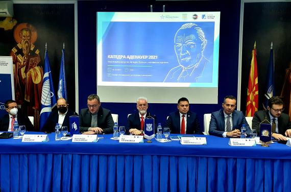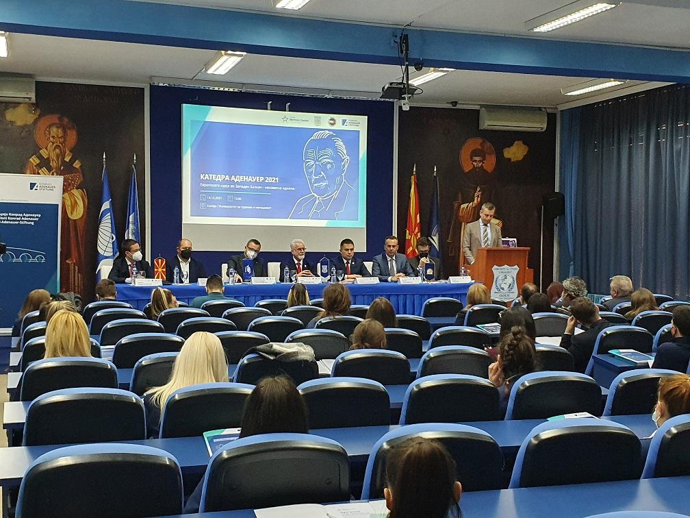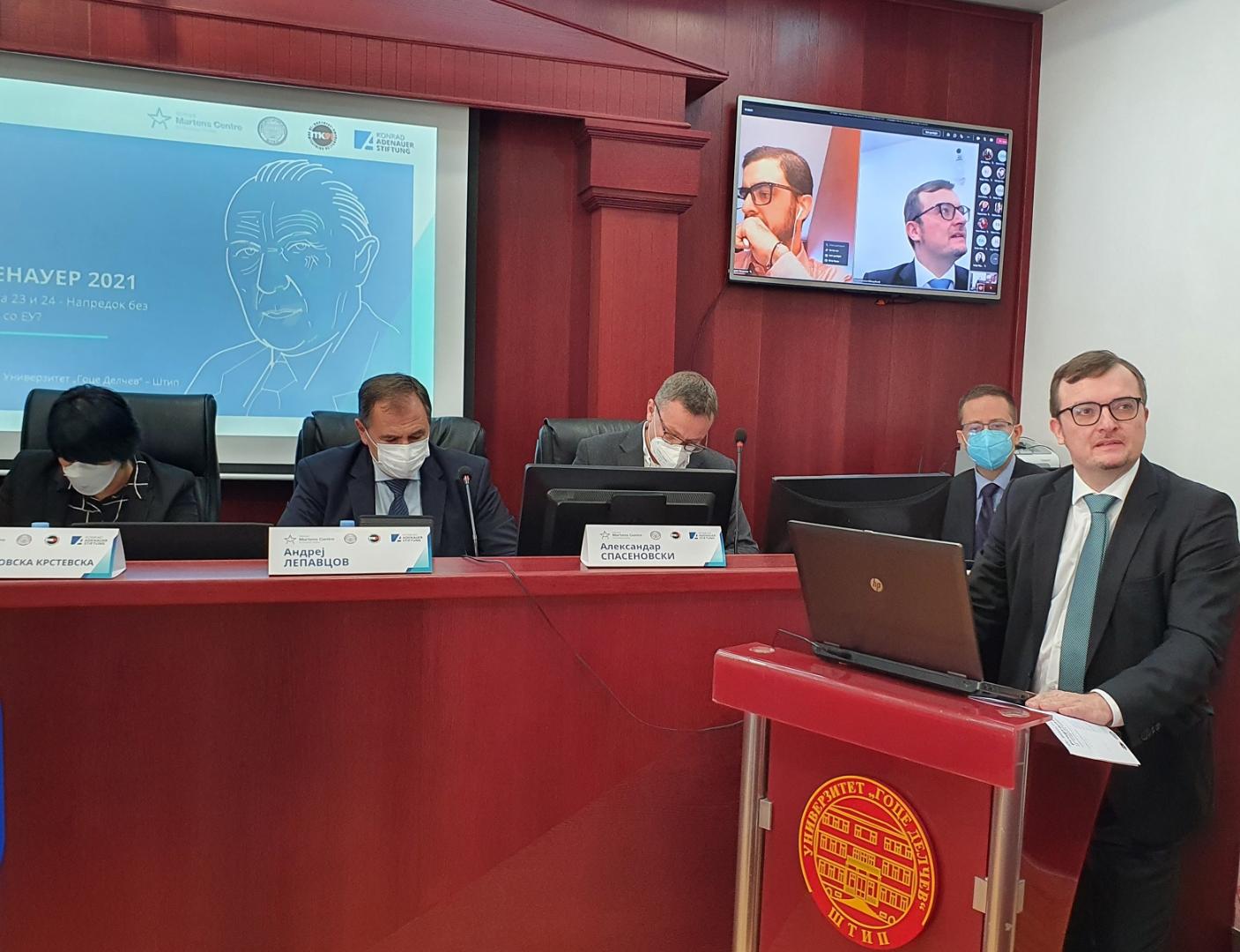 The event was opened by Daniel Braun, Country representative of the Konrad Adenauer Foundation, Panos Tassiopoulos, Head of External Cooperation and Events at the Wilfried Martens Centre for European Studies and Olga Koshevaliska, Dean of the Law Faculty at the University of Goce Delchev in Shtip.