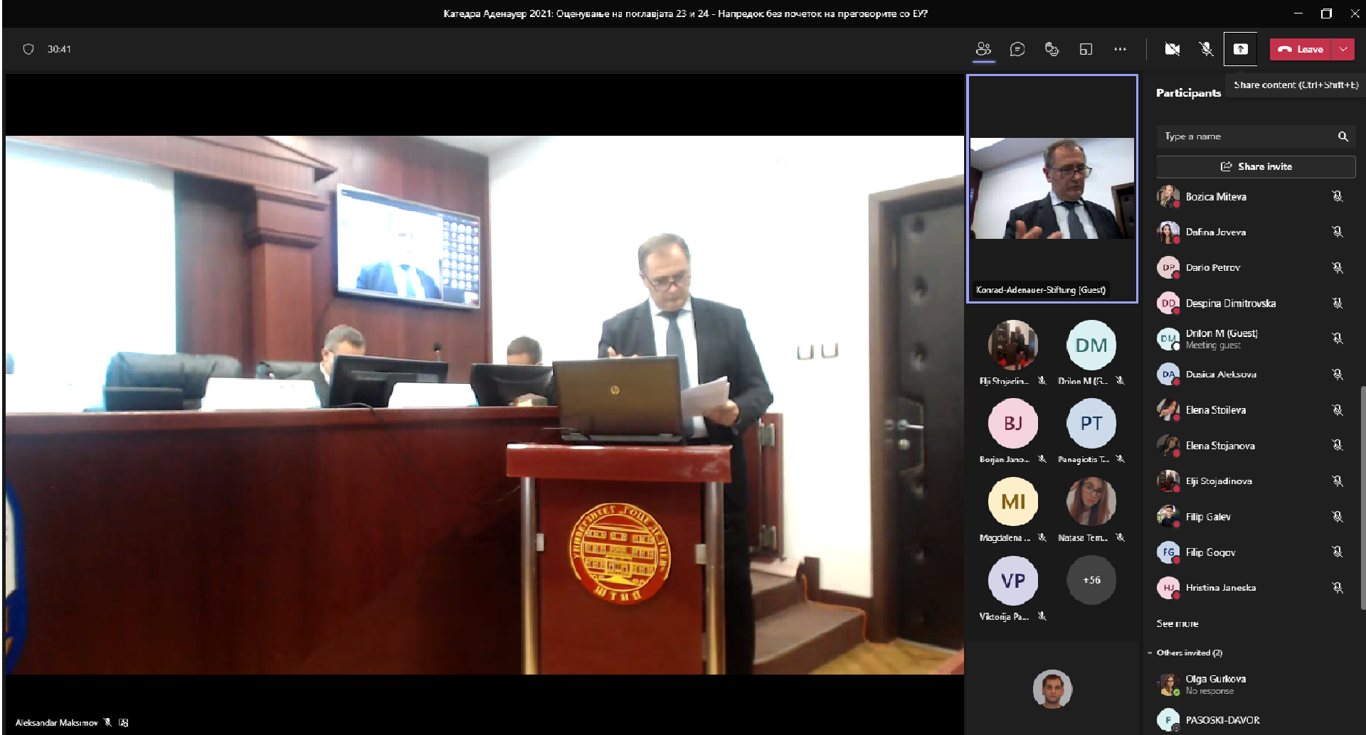 Ana Nikodinovska Krstevska, Associate Professor of EU Law at the University "Goce Delchev" – Stip, analyzed the necessary steps to be taken in order to achieve better results in the chapters 23 and 24, including the reforms in the judiciary and the legislation. The former Ambassador to the EU, Andrej Lepavcov shared his views on the state of affairs in the judicial system, and the remarks given by the EU institutions in this area. Aleksandar Spasenovski, Professor at the Faculty of Law "Iustinianus Primus" – Skopje, discussed the relations between the state institutions in the country, in the context of European integration. Professor Vasko Naumovski gave an overview of the progress in fulfilling the accession criteria in the last decade, especially in areas covered by chapters 23 and 24. Boris Josifovski, Chief of Staff, Cabinet of the former President H.E. Gjorge Ivanov (2019-2019), explained the relations between the two chapters and the political developments, while the Lawyer Kosta Bogdanov from the Bogdanov & Bogdanov Law Firm, shared his experience in the area of human rights protection, the rulings of the European Court of Human Rights, as well as their implementation into the domestic legal system. The panel discussion was moderated by Jovan Andonovski, Associate Professor of Law at the University "Goce Delchev" - Stip.