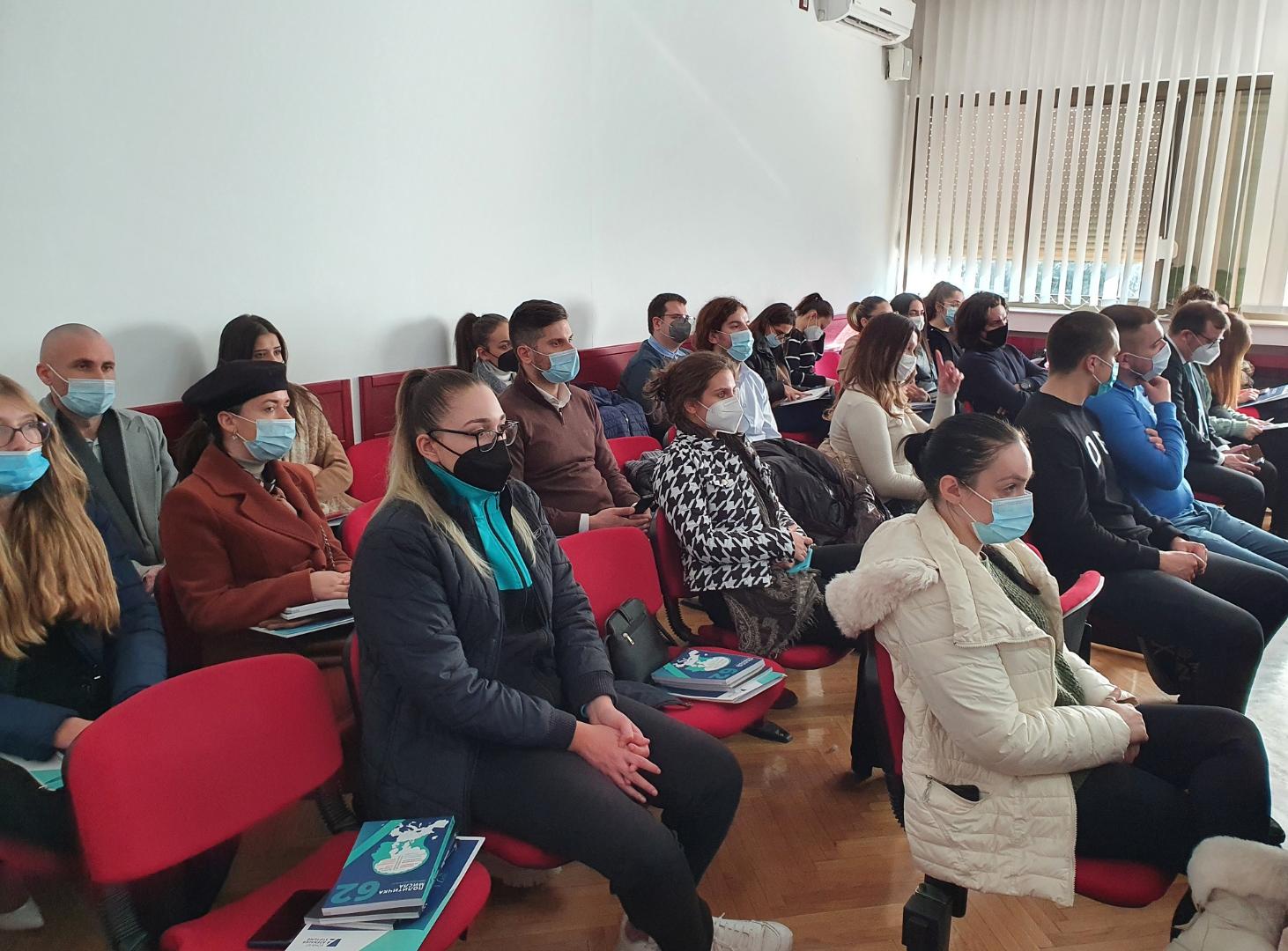 Ace Milenkovski, Rector of the University for Tourism and Management - Skopje (UTMS) emphasized the need for reforms and application of the European standards in the higher education, aiming to increase the quality and the competitiveness of the university graduates. This was followed up by Sashko Gramatnikovski, Dean of the Faculty of Tourism at the UTMS, who discussed the challenges in this area, providing several examples on possible improvements. Vasko Naumovski, Professor at the Faculty of Law "Iustinianus Primus" – Skopje, discussed the current state of affairs, including the bilateral disputes in the Balkans, the credibility of the EU in the region, as well as the foreign influences that might endanger the European values. The former Minister of Finance, Kiril Minoski gave a presentation on the economic developments, the fulfillment of the economic criteria for accession, as well as the general direction of the economies of the countries in the region. Jovan Andonovski, Associate Professor of Law at the University "Goce Delchev" – Shtip, spoke about the human rights in the Balkans, its relations with the EU accession process, and the overall political criteria for accession. Ivan Ivanov, Assistant Professor at the International Balkan University – Skopje, analyzed the global role of the EU, its relations with other entities, as well as the overlapping influences in the region. Moderator of the event was Aleksandar Spasenovski, Professor at the Faculty of Law "Iustinianus Primus" – Skopje.