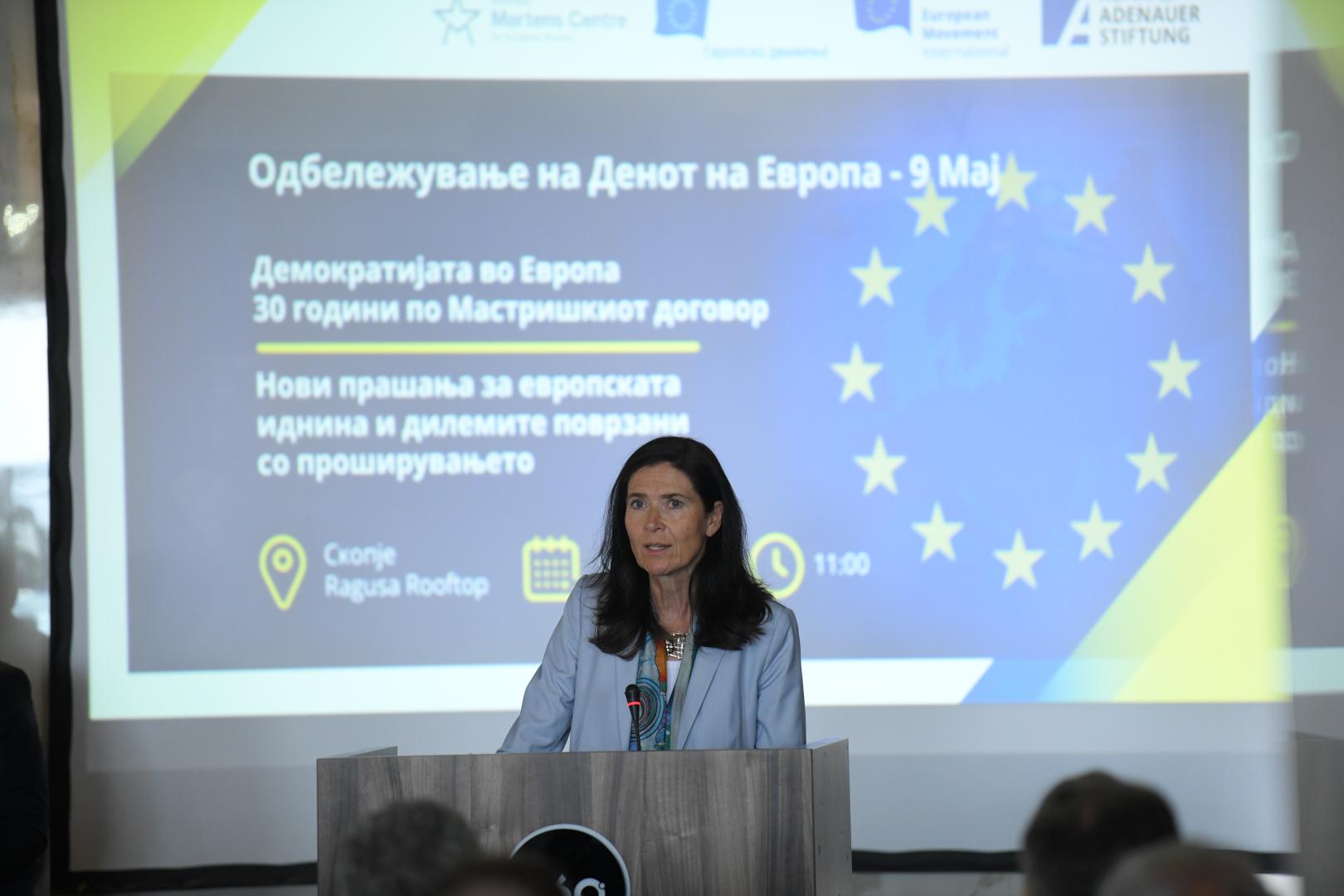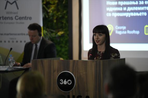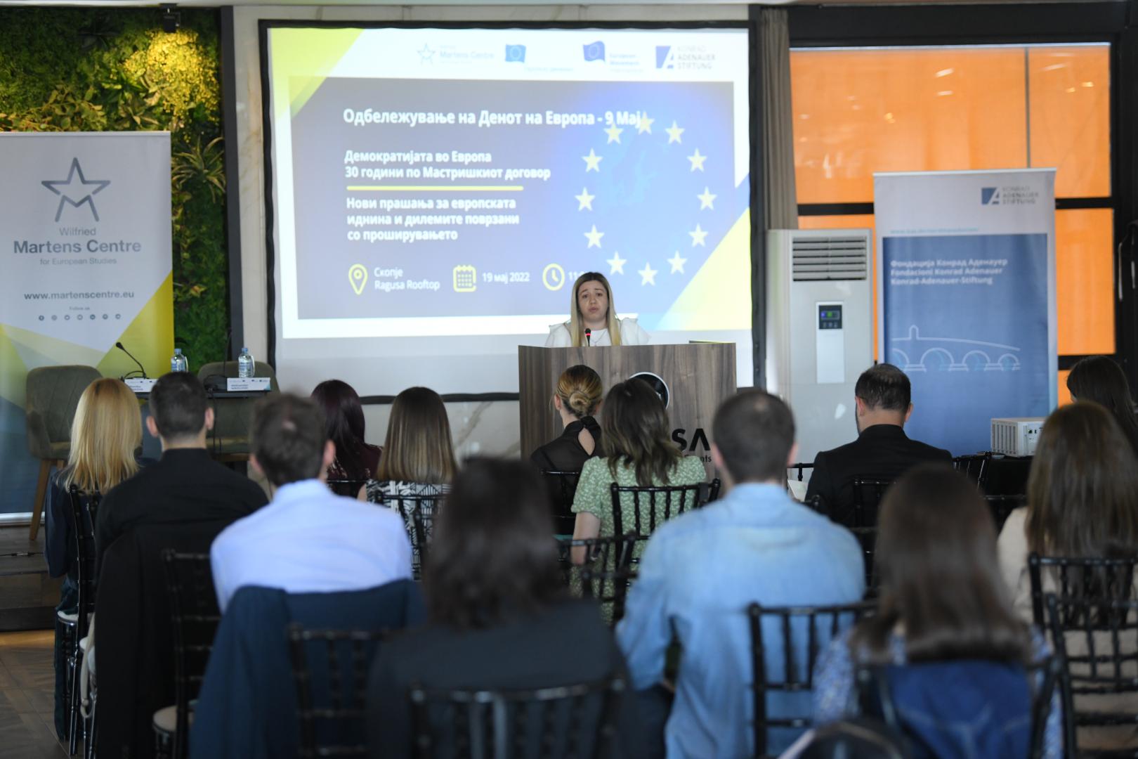 In her welcoming address, Katerina Jakimovska, Senior Event Officer at the Wilfried Martens Centre for European Studies, noted that this year the celebration of Europe Day took place in a bitter atmosphere due to the conflict in Ukraine and that its implications were strongly felt in the Western Balkans, a region located in a crossroad, which increasingly raises the question ‘whether this region will be able to maintain the European course since Europe is our task and mission’.