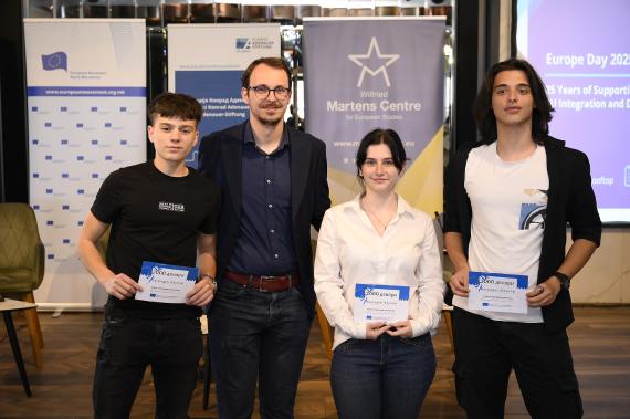 The day concluded with an Oratory Competition, featuring 14 students from five different universities who delivered powerful speeches expressing their most pressing concerns with impressive rhetorical skill. The winner of the competition was Lindita Ferati from South East Europe University – Tetovo, Sofija Bislimoski from the University of Ss. Cyril and Methodius - Skopje took second place, while Darko Trpkovski and Hristina Garabiljevikj from the University of St. Kliment Ohridski – Bitola shared third place. Following this, the final event was an EU Knowledge Quiz, where nine students from three different high schools in Skopje showcased their understanding of the European Union. The winner was Aleksej Stojanovikj from Rade Jovcevski Korcagin High School, with Evgenija Ninkovska from Georgi Dimitrov High School securing second place, and Blagoja Angelov from Nikola Karev High School finishing third.