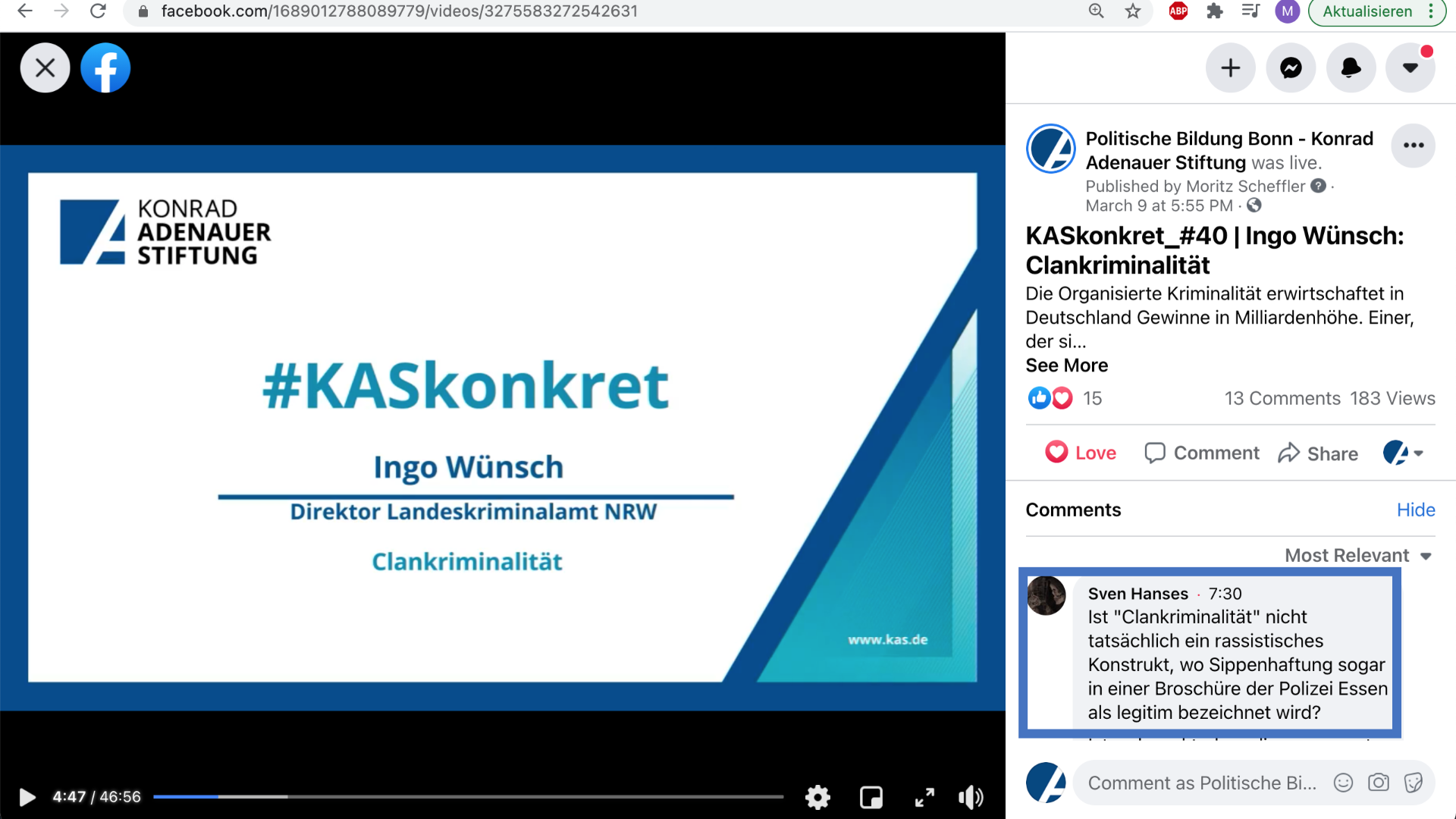 Wie immer haben wir das Gespräch live auf unserem Facebook-Kanal übertragen, um möglichst vielen Menschen die Möglichkeit zu geben, mitzudiskutieren. Eine der ersten Fragen kam von Sven Hanses, der von dem LKA-Chef wissen wollte, ob der Begriff Clankriminaliät nicht ein rassistisches Konstrukt sei – und Sippenhaftung legitimiere. (siehe Screenshot oben)