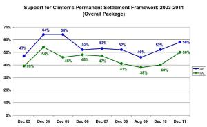The Joint Israeli-Palestinian Poll has been tracking the level of support and opposition to the Clinton permanent settlement framework regularly since 2003. Amidst a turbulent Middle East and the political and diplomatic stalemate between the two sides, our December poll shows an increase in support for the Clinton permanent settlement framework on both sides. 58% of Israelis and 50% of Palestinians support a permanent settlement package along the Clinton parameters; 39% of Israelis and 49% of Palestinians oppose such a settlement. These results mark a significant increase in both sides’ willingness to compromise compared to recent years.