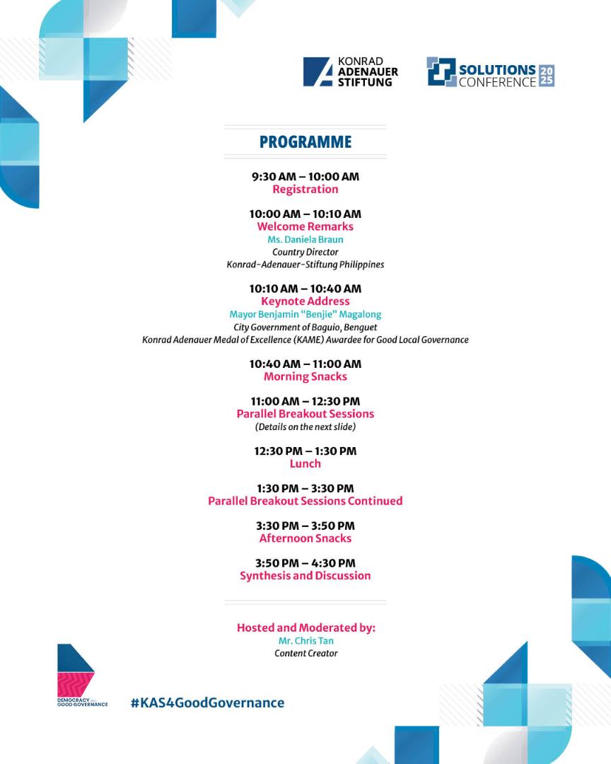 The conference focuses on practical ways communities can work with or even partner with local governments to solve urgent problems. Through a keynote by Mayor Benjamin “Benjie” Magalong, and three interactive breakout sessions, the conference will explore how to (1) rebuild public trust and encourage citizen action; (2) modernize local government services through smart and simple solutions; and (3) strengthen community resilience to climate and disaster risks. At the end of the conference, participants are expected to leave with concrete ideas, tools, or partnerships to drive change in their own communities, starting at the local level.