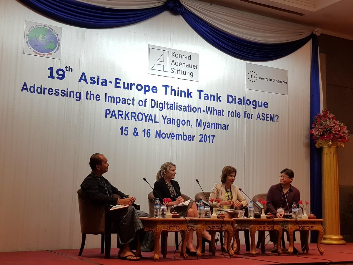 At the dialogue entitled “Addressing the Impact of Digitalization – What role for ASEM?”, think tank representatives from 18 countries analyzed expectations for the 13th ASEM Foreign Ministers’ Meeting, the current status of ASEM and discussed the effects of digitalization on selected spheres. The Myanmar Institute for Strategic and International was the local partner in the host country.