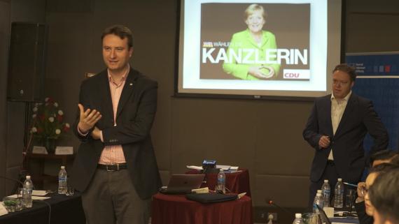 Just how much the KASYP training can impact the political career of a participant was brought home by Honourable Biraj Bista, KASYP Alumni and former MP and Minister of Science and Technology in Nepal. Hon. Bista shared his experiences with KASYP, how his KASYP training helped him in his political life as well as updates on the political situation in Nepal after the recent elections. Of particular interest to all of us was his vivid description of how he, as a minister, implemented political strategies and priorities he learnt with KASYP in real life in Nepal. The training programme also included in-depth introductions into democratic theory and practice, such as various electoral systems. Dr. Sandeep Shastri, Pro Vice Chancellor at the Jain University, covered plenty of country specific examples from Asia to Europe and their advantages and limitations. He argued that “electoralising” a country is a necessary, but not sufficient step of democratisation. Mr Ibrahim Suffian of the Merdeka Center for Opinion Research in Malaysia proceeded and covered the background, utilisation and implications of opinion polling and elections. More specifically, he covered the uses of political polling in campaigning within the region, providing case studies and the use of polling to benefit campaign strategies. He also stressed the disadvantages of polling, such as a potentially false confidence polling may give to politicians. But he maintained that trends are useful indicators and can add significant value to campaigns, if they are interpreted correctly. The final day saw all KASYP representatives present an update on their political projects as well as selected country updates and subsequent debates.