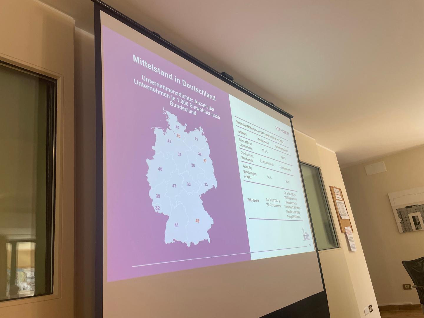 Claudia Martina Buhl, stv. Leiterin des Bereiches "Demografie, Cluster und Zukunftsforschung" bei VDI/VDE Innovation + Technik GmbH, zeigte den Teilnehmern anschließend die Bedeutung des Mittelstandes als Rückgrat der deutschen Wirtschaft, insbesondere auch mit Blick auf Innovationen im wirtschaftlichen Bereich, auf. Im Fokus standen vor allem technische Innovationen, aber auch Innovationen innerhalb von Prozessketten oder im Service- und Dienstleistungsbereich kamen in Vortrag und Diskussion zur Sprache. Herausgestellt wurde, dass ein großer Anteil an finanziellen Fördermitteln des Bundes in Energie-, Umwelt- und Nachhaltigkeitstechnologien fließen würden. Vertieft wurde gleichfalls und insbesondere die Frage „Wie bleiben wir wettbewerbsfähig?“ behandelt, wobei dies an verschiedenen Kategorien wie Wirtschaftsleistung und Infrastruktur – auch im internationalen Vergleich – geschah.