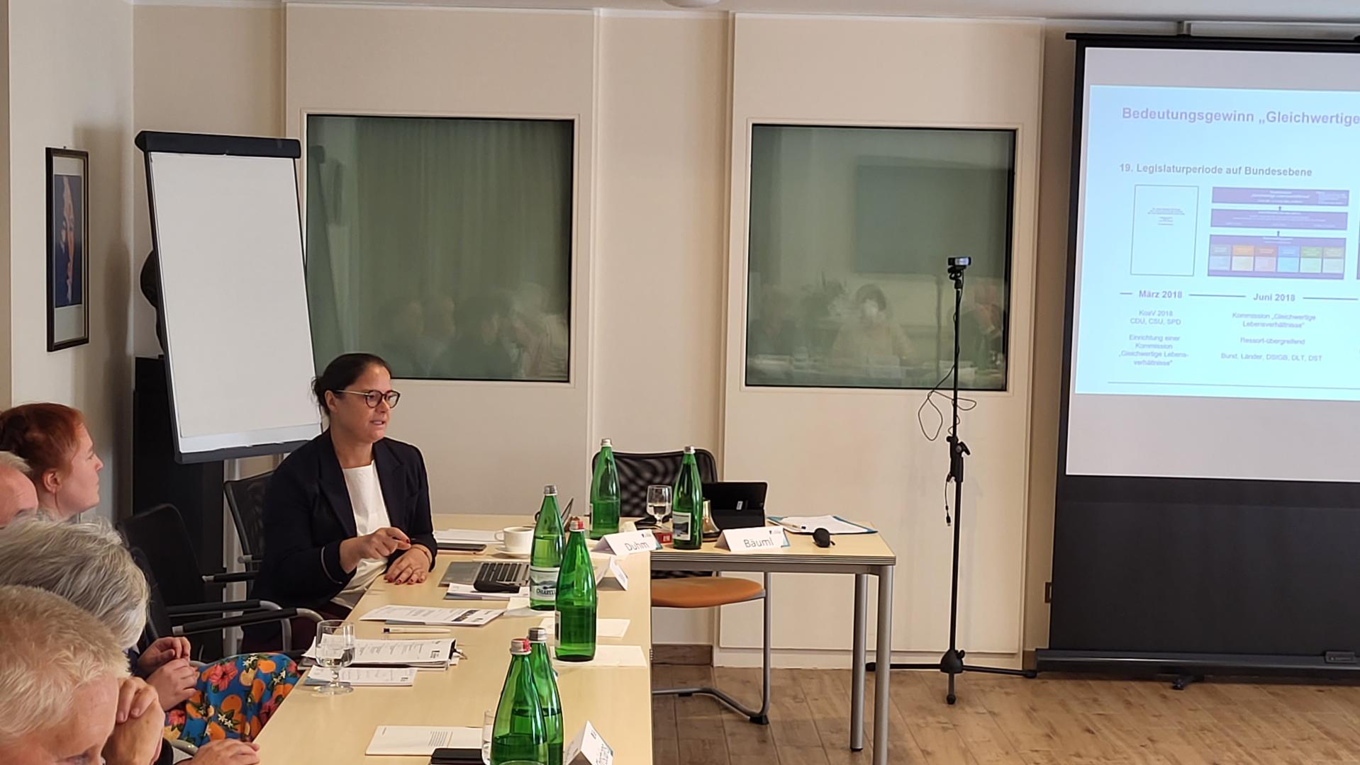 Claudia Buhl, stv. Leiterin des Bereiches „Demografie, Cluster und Zukunftsforschung“ bei VDI/VDE Innovation + Technik GmbH in Berlin, bediente sich einführend verschiedener Kennzahlen, mit denen sie den ostdeutschen Landkreis Prignitz mit der Region Stuttgart verglich. Faktenbasiert wurde so dargestellt, dass die Lebensverhältnisse mit Blick u.a. auf Mobilität, medizinischer Versorgung oder auch Breitbandausbau unterschiedlich seien und gleichzeitig aufgezeigt, in welchen Bereichen verstärkt Weichen gestellt werden müssten. Gleichfalls wurde sich dem Koalitionsvertrag der letzten Wahlperiode gewidmet, der die Einrichtung einer Kommission für gleichwertige Lebensverhältnisse vorsah. Entstanden ist der sog. „Unser Plan für Deutschland“, der Handlungsempfehlungen mit 12 prioritären Maßnahmen festschreibt. Wichtiger Teil des Maßnahmenpaketes sei ein gesamtdeutsches Fördersystem für strukturschwache Regionen, auch mit Blick auf dörfliche Gemeinschaften und die landwirtschaftliche Entwicklung. Mit Blick auf den gesellschaftlichen Zusammenhalt im Land sei es wichtig, keine Regionen aufzugeben und extremistischen Parteien keine Grundlage zu bieten, so die Referentin weiter.