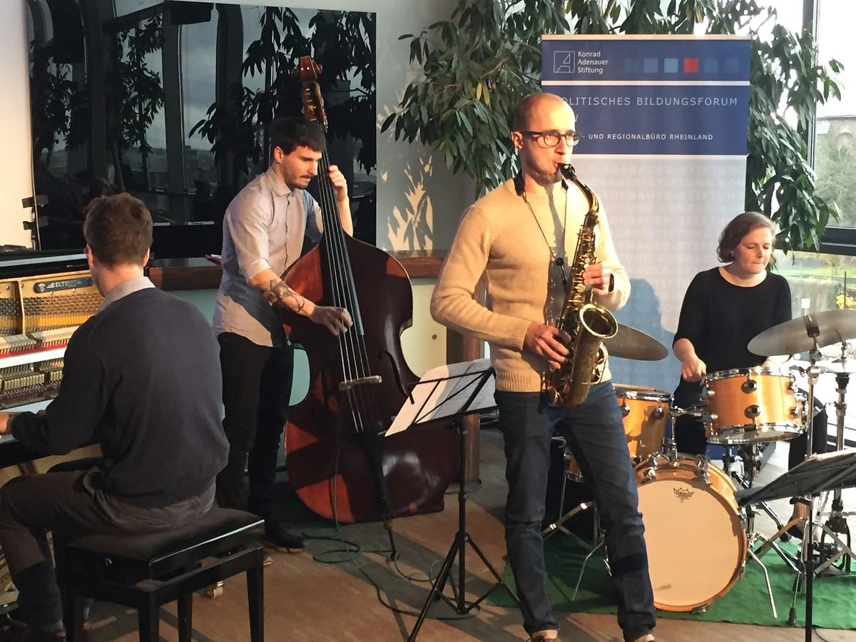 Viele Aspekte wurden im Gespräch angesprochen, was vor Augen führte, wie sehr die Digitalisierung bereits Teil des Alltags geworden ist – bewusst und unbewusst. Zum Abschluss der Veranstaltung lud das Regionalbüro Rheinland der Konrad-Adenauer-Stiftung zum weiteren Verweilen und Diskutieren in der Pegelbar mit Blick über die Dächer von Neuss ein. Dabei spielte das Eva Kleese Quartett einige Jazz-Stücke. Die Band um Eva Klesse, Evgeny Ring, Philip Frischkorn und Robert Lucaciu begeisterte dabei mit ihren Instrumenten ganz analog.