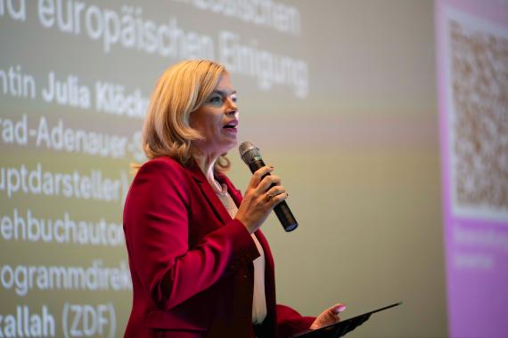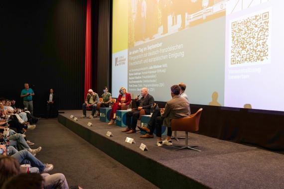 Die am Veranstaltungstag noch unveröffentlichte Produktion beleuchtet vielschichtig jenen 14. September 1958, an dem sich Adenauer und de Gaulle im Landhaus des Generals in Colombey-les-Deux-Églises trafen - eine wichtige Station auf dem Weg zum deutsch-französischen Freundschaftsvertrag von 1963. Am Veranstaltungsort Bad Kreuznach fand am 26. November 1958 der Gegenbesuch, das erste offizielle Regierungstreffen zwischen Deutschland und Frankreich und mit ihm die erste Zusammenkunft Adenauers und de Gaulles auf deutschem Boden, statt. Nach der Vorführung tauschten sich auf dem Podium Bundestagspräsidentin Julia Klöckner MdB, der stellvertretende ZDF-Programmdirektor und Leiter der ZDF-Hauptredaktion Frank Zervos, Adenauer-Filmdarsteller Burghart Klaußner, Drehbuchautor Fred Breinersdorfer und Marine Vadelorge von der KAS Paris aus. Moderiert vom ZDF-Logo!-Moderator Sherif Rizkallah sprachen sie mit den Schülerinnen und Schülern. In der Diskussion mit zahlreichen aktuellen Bezügen wurde überdeutlich, wie wertvoll die deutsch-französische Zusammenarbeit für beide Länder, Europa und die Welt geworden ist – und dass es auch heute noch darauf ankommt, diese Freundschaft zu pflegen, wo nötig neu zu beleben und mit originellen Ideen weiterzuentwickeln.