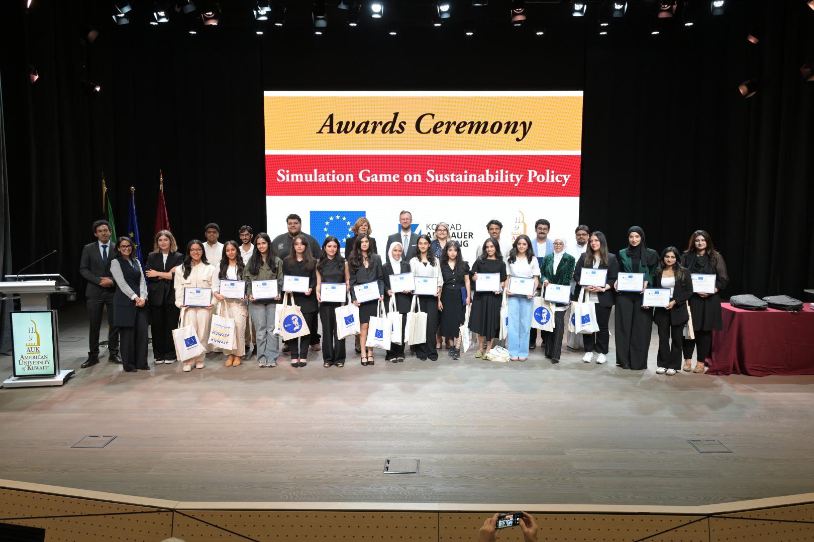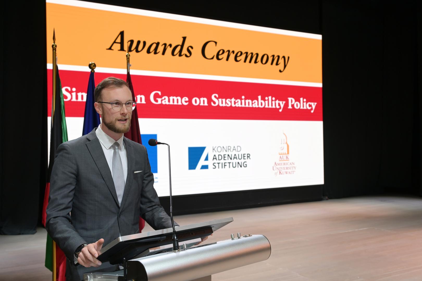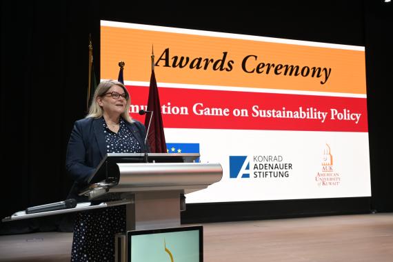 The simulation game concluded with a closing ceremony, attended by EU ambassadors and representatives, AUK staff and students. The president of AUK, Dr Rawda Awwad, initiated the ceremony, highlighting the game's role in empowering students to think and act globally. The EU ambassador to Kuwait H.E. Anne Koistinen underscored the pivotal role of role of the EU spearheading climate action, both on the European continent and beyond. KAS Regional Programme Director Philipp Dienstbier emphasised the necessity of engaging youth in climate affairs, as the impacts of climate change will have an imminent effect on the young generation in the region.