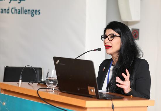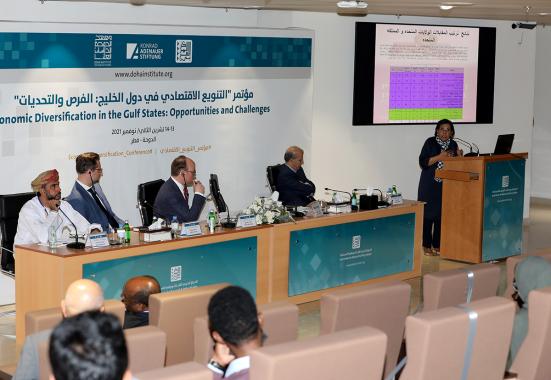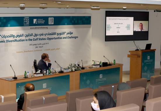 The conference began with opening remarks by Dr. Hamid Ali, the Dean of the School of Public Administration and Development Economics at the Doha Institute; Dr. Canan Atilgan, Head of the Middle East and North Africa Department at Konrad-Adenauer-Stiftung (KAS), and Dr. Haider Saeed, Head of the Research Department at the Arab Center, who welcomed the participant speakers and attendees, and emphasized the importance of economic diversification for the Gulf States.