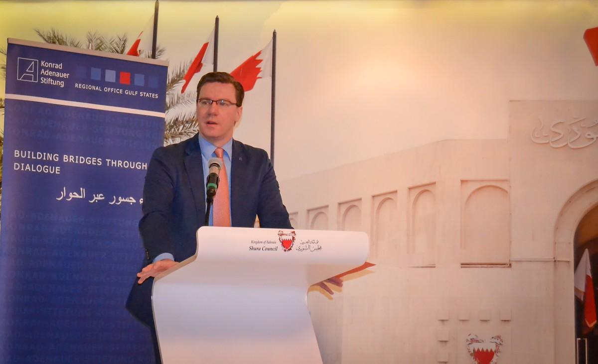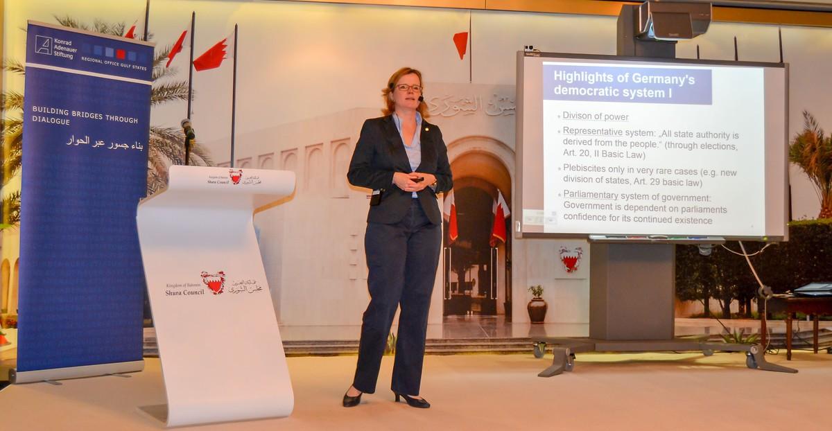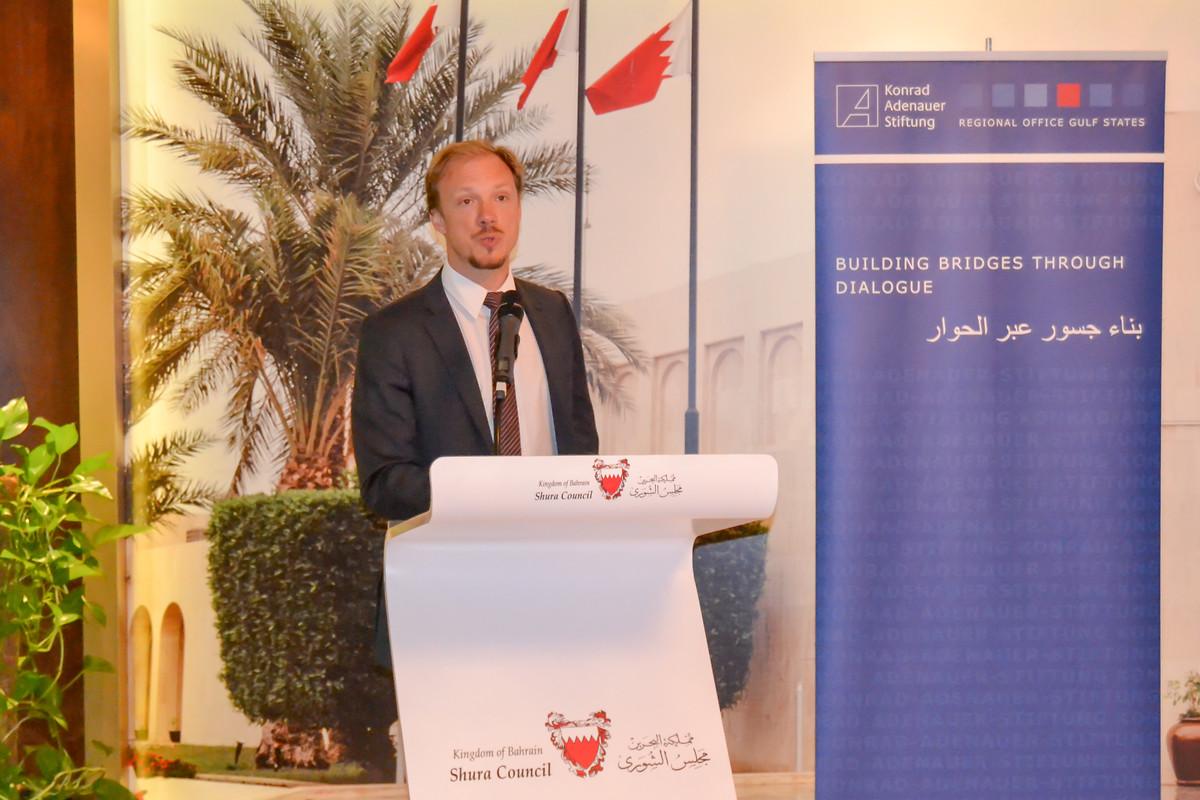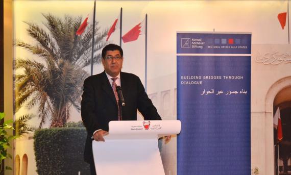 While the protests did indeed dominate Western media time and again, the progress that had already been made with regard to parliamentary participation went virtually unnoticed. However, it is parliamentary participation which has as a long tradition in Bahrain and could contribute to alleviating the political tensions as pointed out by the workshop participants. “Every country has its own way of shaping legislation”, German Ambassador Alfred Simms-Protz explained at the beginning of the event. Even though Bahrain is a Kingdom, the Gulf State established a complex legislative system early on. Now members of the upper house gathered together to exchange views on the legislative processes in Germany, Europe and Bahrain at the event entitled “The Role of Assemblies in Shaping Legislative Power”.
