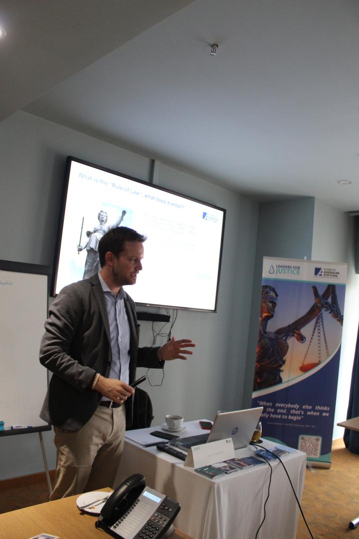 - “Introduction to the Rule of Law”, this session given by Mr. Philipp Bremer, the director of the Rule of Law Programme Middle East and North Africa. He acquainted the 11 motivated lawyers with German criminal law and the German constitution, particularly the freedom of speech from Art. 5 GG, through case studies. A discussion was initiated regarding the exact components of the Rule of Law, during which the participants had the opportunity to present their own perspectives. The necessity of a functioning separation of powers to avoid an abuse of power to a certain extent was also a central topic.