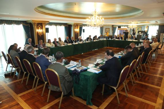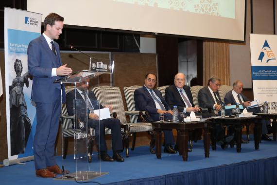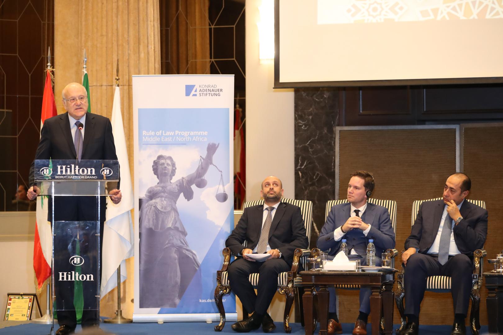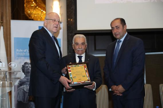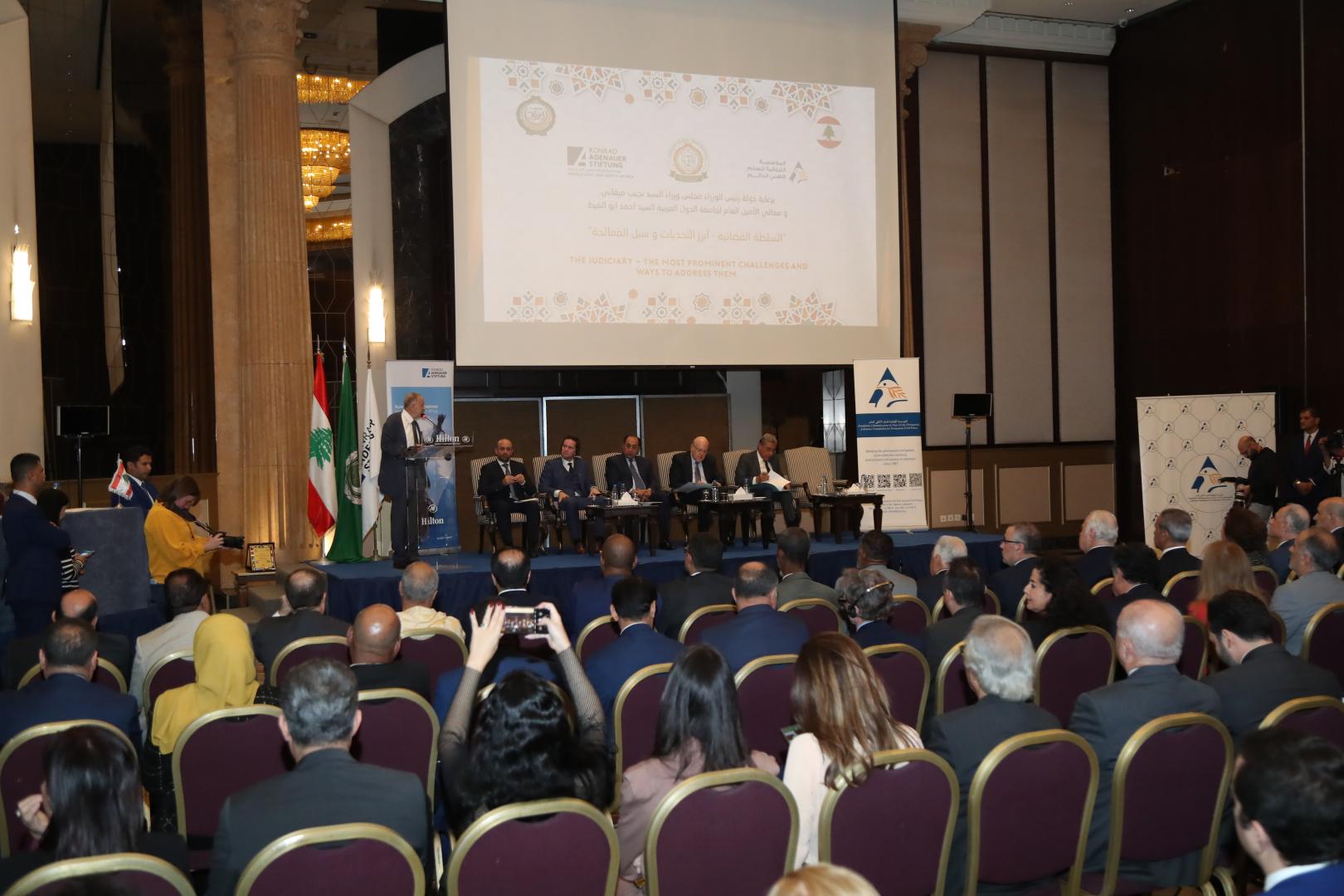 At 10 a.m. on Thursday the 10th and following arrival and registration, the day officially commenced with an opening session that included speeches given by Dr. Antoine Messarra (head of the Lebanese Foundation for Permanent Civil Peace), Mr. Philipp Bremer (head of the Rule of Law Program Middle East and North Africa of the Konrad-Adenauer-Stiftung), H.E. Judge Henry Khoury (head of the Arab Center for Legal and Judicial Studies) and H.E. Houssam Zaki (Assistant Secretary General of the Arab League) and H.E. the Lebanese Prime Minister Najib Mikati. Afterwards, the signing of the protocol between the Lebanese Government and the Arab League took place, which undertook a donation of a plot of land to the Arab Center for Legal and Judicial Research from the Lebanese Government. This was followed by the delivery of a trophy of distinction on the judicial training to the State of Palestine on behalf of the Arab Center for Legal and Judicial Research.