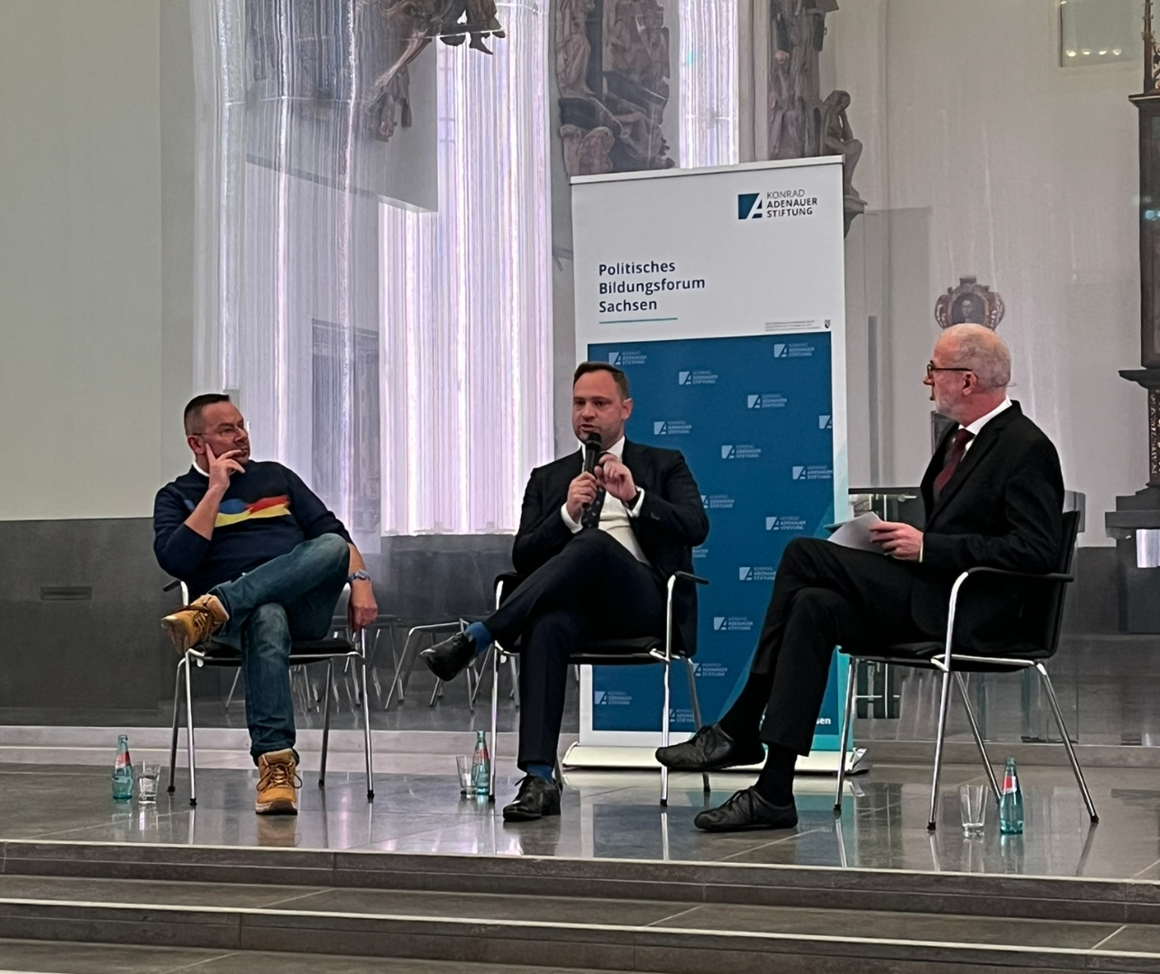 Dank der Kooperation mit der Universität Leipzig konnte die Veranstaltung, moderiert von Stephan Hoberg (PBF Sachsen) in einem besonders würdigen Rahmen im gut gefüllten Paulinum stattfinden. Nach der Eröffnung durch Prof. Dr. Eva Inés Obergfell, Rektorin der Universität Leipzig, begrüßte Ronny Heine, Landesbeauftragter der Konrad-Adenauer-Stiftung für den Freistaat Sachsen, die Anwesenden. Es folgte ein Grußwort des Präsidenten des Sächsischen Landtags, Alexander Dierks MdL, bevor der inhaltliche Teil des Abends begann.