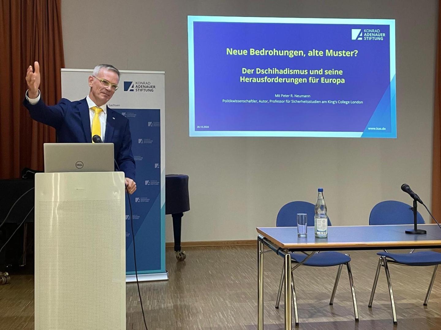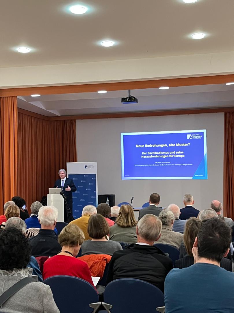 Prof. Dr. Peter Neumann begann seinen Vortrag mit einem eindringlichen Appell, jetzt zu handeln. Er erläuterte, dass Dschihadismus seit Jahrzehnten in zyklischen „Wellen” auftrete, die meist von entscheidenden Ereignissen angestoßen würden. Neumann schilderte seine umfassende Forschung zu diesen Wellen, in der er geschehene sowie verhinderte Anschläge dokumentierte.