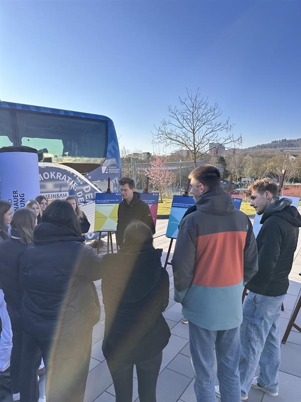 Wie funktioniert unsere Demokratie? Was bedeutet Demokratie für mich? Wie kann ich mich selbst einbringen? - Diese und weitere Fragen standen beim Stopp des Demokratie-Busses an der Goetheschule in Wetzlar im Mittelpunkt. Der Demokratie-Bus fährt aktuell unter dem Motto #NurZusammenLäufts durch ganz Deutschland, um zum einen zu zeigen, dass Demokratie nicht selbstverständlich ist und zum anderen über Veränderungsmöglichkeiten, Engagement und aktuelle Herausforderungen ins Gespräch zu kommen.