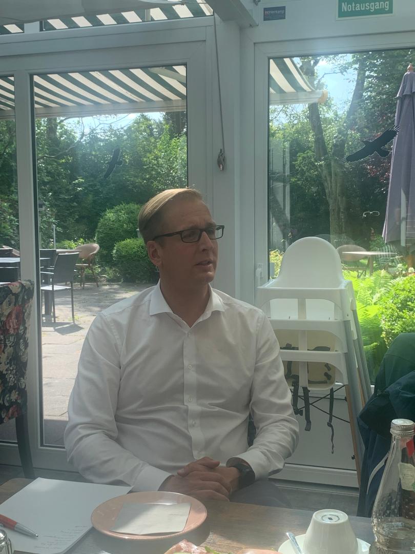 Hierbei ging er auf mehrere Themen ein, die für den Landkreis von zentraler Bedeutung sind. Als Küstenlandkreis spielt die Wesermarsch eine besondere Bedeutung bei der Energieversorgung mit Erneuerbaren Energie, da dort gute Bedingungen für Windkraft und Solaranlagen vorherrschen. Zudem ist der Landkreis durch das ehemaligen Atomkraftwerk Unterweser sehr gut an das deutsche Stromfernnetz angeschlossen, sodass es ideale Bedingungen gibt, den Strom ins Hinterland zu liefern. Des Weiteren besitzt die Wesermarsch eine größere Anzahl an Gaskavernen, die auch zur Lagerung von grünem Wasserstoff genutzt werden könnten. Mit dem Baubeginn des LNG Terminals in Wilhelmshaven könnte der Kreis eine Rolle bei der Lagerung von flüssig Gas als Brückentechnologie bilden. Der Kreis zwischen Jadebusen und Weser ist weiterhin im Rennen um die Endlagerlösung für Atommüll, auch wenn dies Endlager in 1.Mio Jahre höchstwahrscheinlich unter dem Meeresspiegel sein könnte.