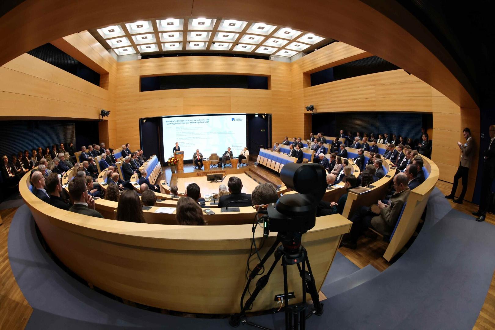 In der anschließenden Festrede stellte der Vizepräsident des Gerichtshofs der Europäischen Union Prof. Dr. Dr. h.c. Thomas von Danwitz diese zentrale Rolle des Rechtsstaats in den Fokus. Dabei benannte er grundlegende Zusammenhänge zur Bedeutung der Rechtsstaatlichkeit für die Demokratie in der Europäischen Union. „Die Beachtung der Rechtsstaatlichkeit in der Europäischen Union ist unverzichtbarer Teil ihrer DNA“, erklärte von Danwitz und mahnte, dass die Antworten zum Schutz der Demokratie in Deutschland und Europa die Lehren aus der Gründung der Bundesrepublik und den Anfängen der europäischen Integration berücksichtigen müssten. Dies sei umso wichtiger angesichts der Gefahren, die von populistischer Politik für die europäische Rechtsgemeinschaft ausgingen. Denn „die Liste der vielfältigen Bedrohungen, denen sich Deutschland und seine Demokratie gegenüber sehen, ist lang“, unterstrich von Danwitz und verdeutlichte die entscheidende Rolle, die dem Unionsrecht bei der wirksamen Durchsetzung zukomme.