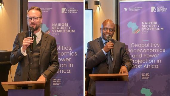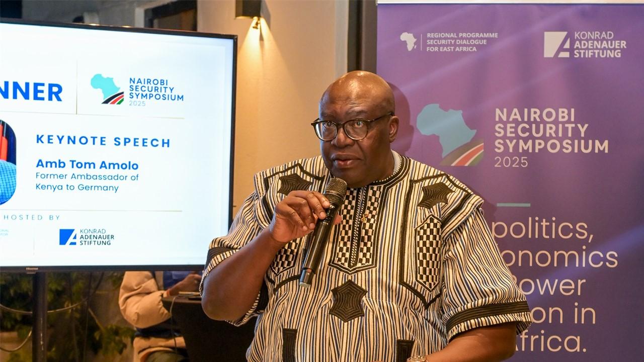 Amb Thomas Amolo, Former ambassador of Kenya to Germany, delivered the keynote speech, expressing gratitude to the KAS and the Horn Institute, and lauding the earlier discussions at the Nairobi Security Symposium. In his speech, he called on East Africans to critically evaluate the region’s trajectory, reflecting on Kenya’s generally stable environment besides the unrest in 2024 and the on and off Gen Z protests. Emphasizing Kenya’s role as a continental leader, he urged the nation to collaborate with its neighbours to promote shared regional interests, asserting, “We are only better together, and we shall not leave anyone behind.” He addressed significant governance and security issues, citing recent incidents during Tanzania’s elections where democratic standards were compromised and human rights were violated and advocated for an African doctrine on democratic governance to enhance accountability. Criticising nepotism and the neglect of diplomatic norms, he highlighted the need for stronger multilateralism, pointing out weaknesses within the AU Peace and Security Council and calling for Africa to reinforce its principles to increase its global influence, including securing permanent UN Security Council representation. He also highlighted ongoing conflicts, particularly around maritime and port access, as well as tensions in Sudan, Somalia, and South Sudan, which are frequently fuelled by external resource interests. In his conclusion, Amb Amolo stressed the need to involve the youth in policy and decision making to prevent future instability.