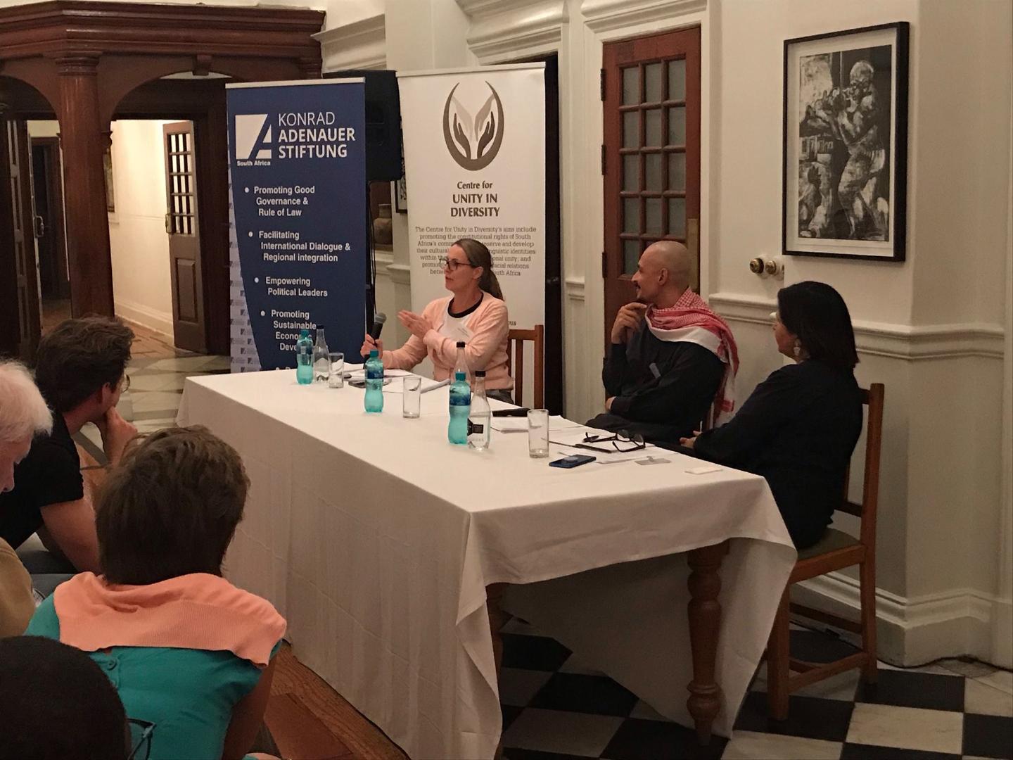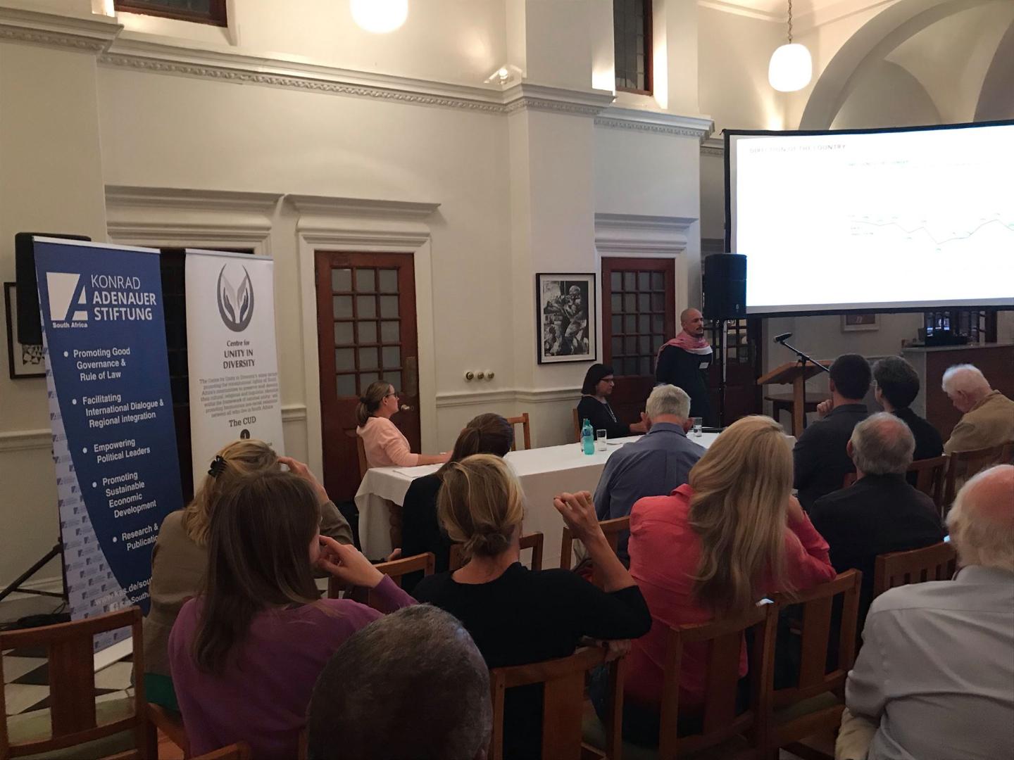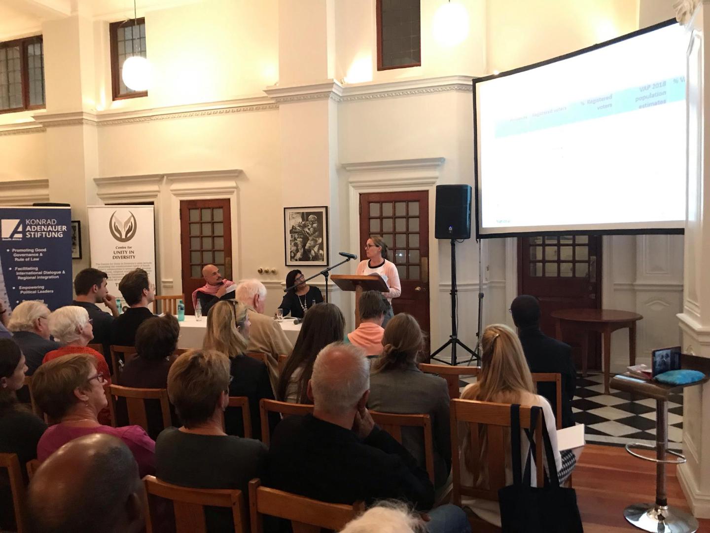 After the welcoming remarks by Zohra Dawood, CUD Director, and Michaela Braun, KAS Project Manager, Dr Collette Schulz-Herzenberg, Senior Lecturer at the Department of Political Studies, University of Stellenbosch and Mr. Reza Omar, Strategy Research Director of Citizen Surveys presented their latest research findings on the upcoming 2019 National Elections.