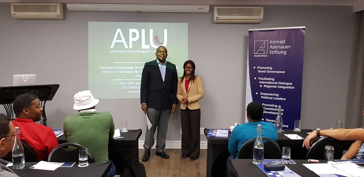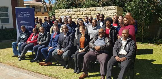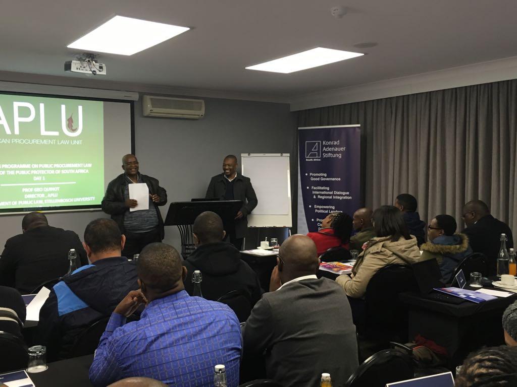 In continuation of the training programme for the Office of the Public Protector (PP), this was the eighth training of this series, which was co-organized by the Head Office of the Public Protector in Pretoria and the Konrad Adenauer Foundation. 28 Investigators from the Northern Cape and Free State Branch of the Public Protector attended the 5-day training in Bloemfontein. The Deputy Public Protector Adv. Kevin Malunga was also present at the training. The content and schedule of the training were developed by Prof. Quinot and Prof. Williams-Elegbe from the African Procurement Law Unit (University of Stellenbosch), who also implemented the workshop.