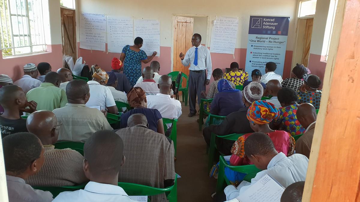 The workshop was guided by a programme developed beforehand, which was circulated to the participants. The workshop content was mainly delivered through interactive plenary discussions. Participants were free to ask questions and make contributions as each topic was being delivered. The comedy display performance at the end of each day summarized the day’s discussions. The first day also included a group discussion in which participants were asked to recall two case studies on women land rights from their communities and analyzed them in relation to the new land law. On the second day, a 25-minutes session was devoted to a panel discussion to test the level of intake by the participants. The panel comprised a ward councilor from the community, a male and female traditional leader and two community members, male and female. The rest of the participants asked questions on women land rights, and the panel responded. This was one indicator to test the extent to which the principles of women land rights were being understood by the participants.
